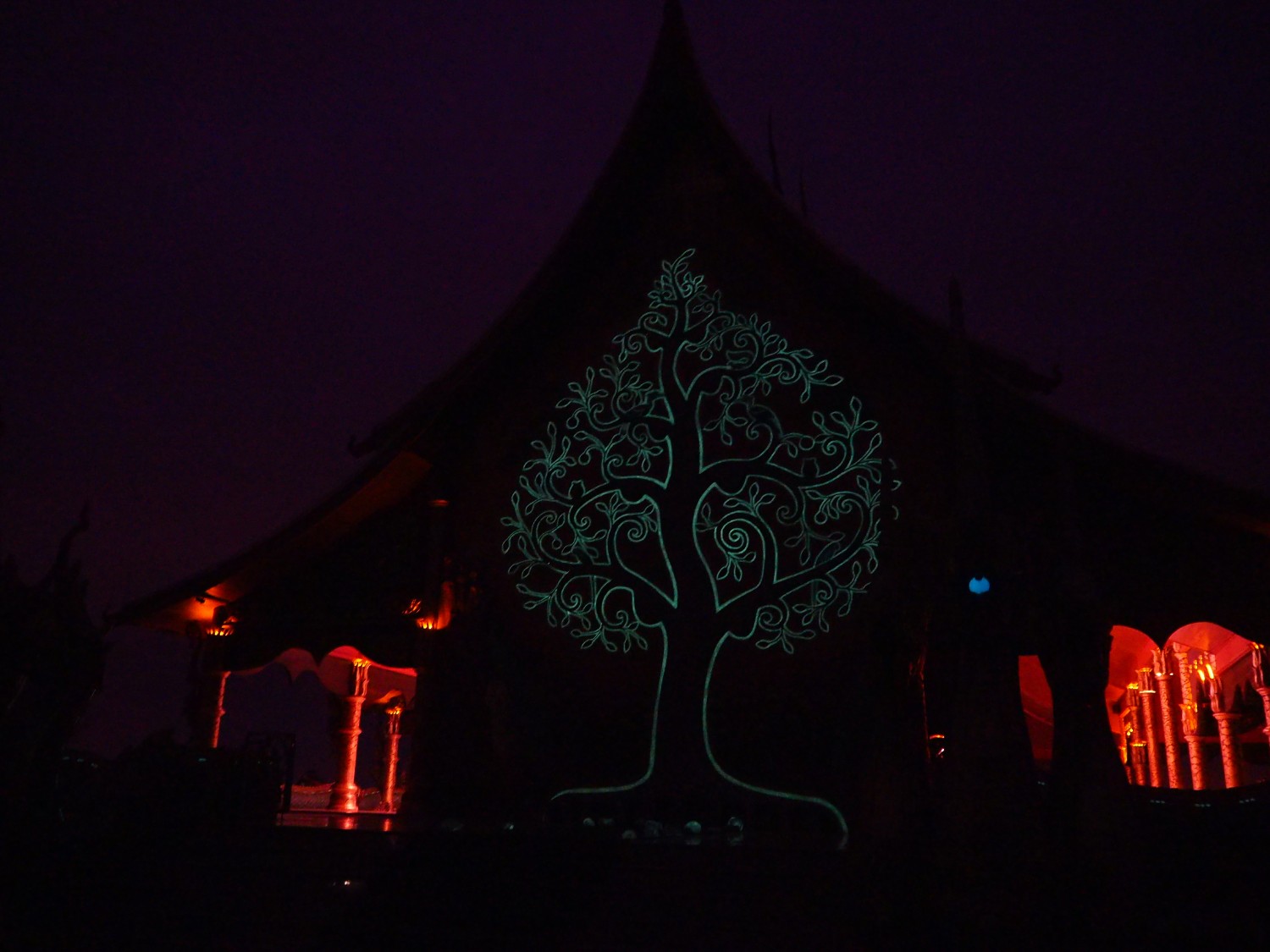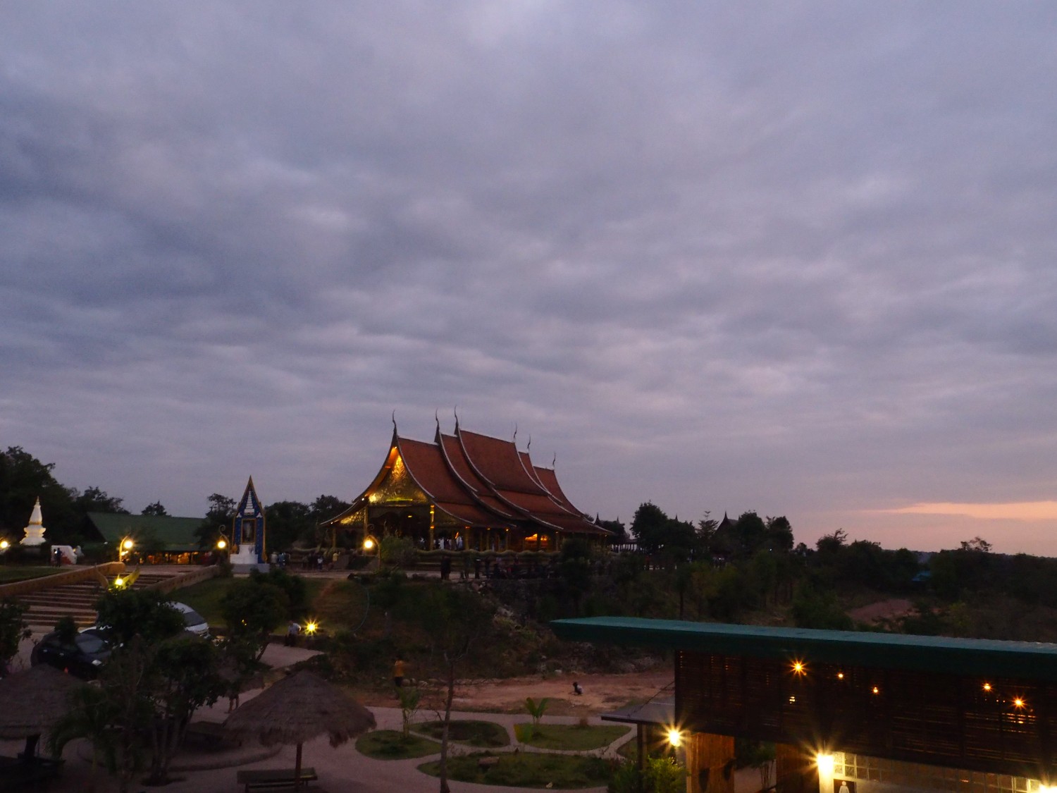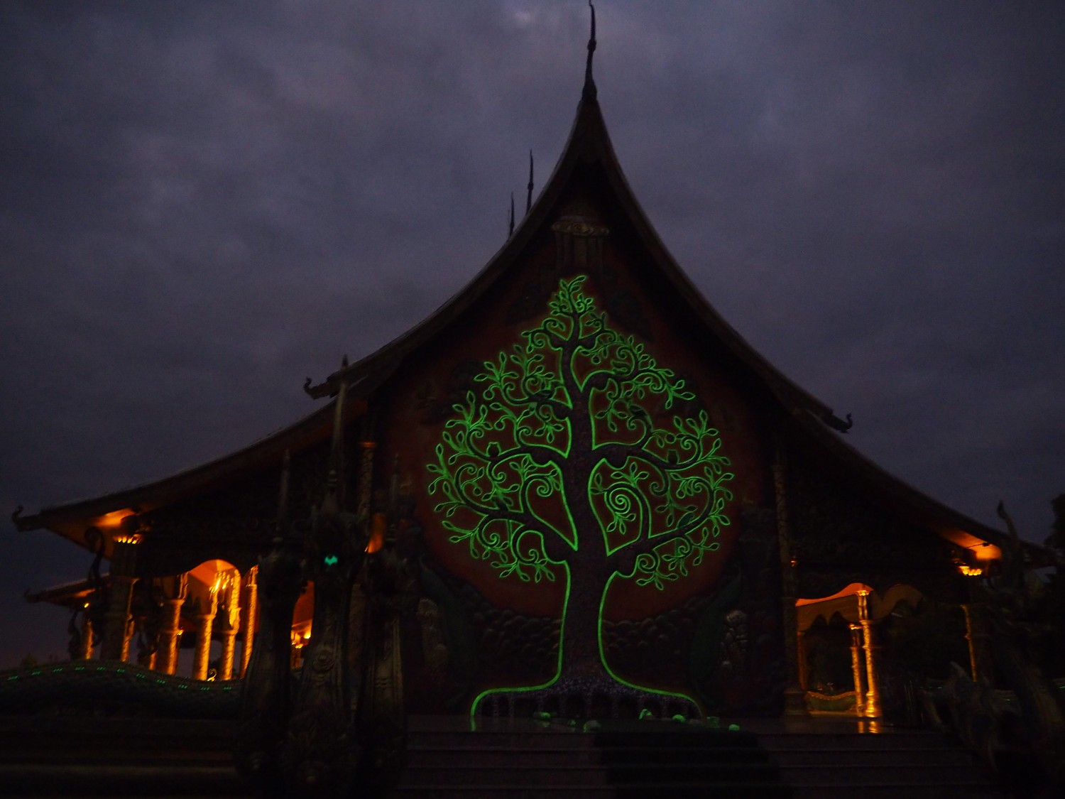 วัดภูพร้าว อีกจุดที่นักท่องเที่ยวจำนวนมากอยากมาดู การออกแบบคือใช้สารฟลูออเรสเซนต์เป็นตัวเรืองแสง โดยจะรับแสงจากดวงอาทิตย์ในตอนกลางวันแล้วพอตอนกลางคืนก็จะเห็นการฉายแสงสวยงาม พอฟ้าเริ่มมืดผู้คนก็หาที่นั่งจับจองรอชมความงามกันเป็นจำนวนมากเลย ก็ถือว่าเป็นภาพที่สวยงามดูอัศจรรย์ดีนะคะ