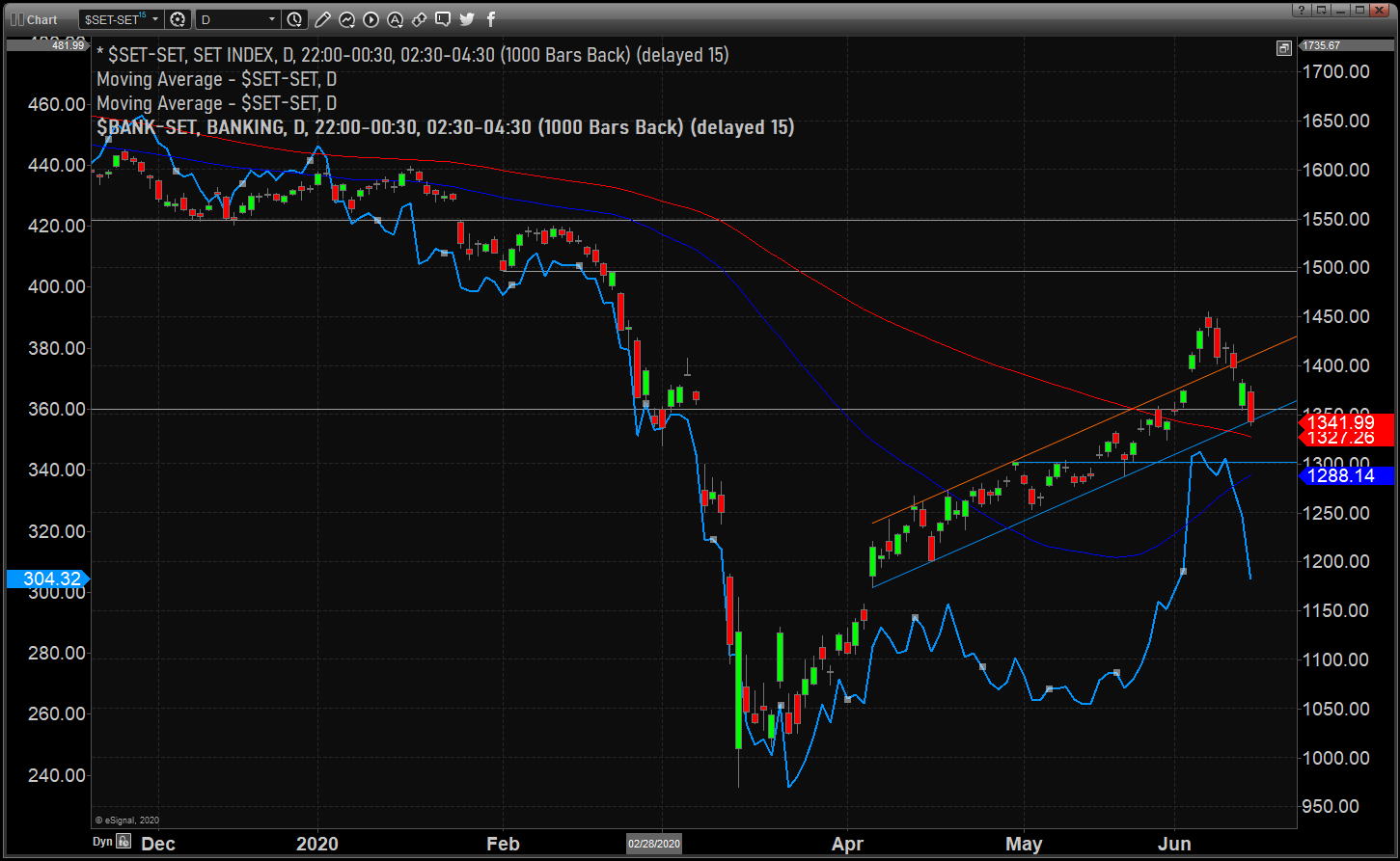 การขายออกในวันจันทร์ ทําให้ดัชนี SET กลับมาอยู่ในขอบล่างของ Bullish trend Channel ที่เสี่ยงที่จะหล่นออก ดูจากทีท่ามีความเป็นไปได้มากที่จะรีบาวด์วันอังคาร แต่ความชันของ channel ทําให้จําเป็นที่จะต้องมีแรงผลักดันอย่างมหัศจรรย์ (ท่ามกลางข่าวโควิด-19 ในจีนและข้อมูลเศรษฐกิจโลกที่ดูแย่) แถมตอนนี้ตลาดยิ่งน่าเป็นห่วงมากขึ้น ว่ากลุ่มแบงก์ (เส้นสีฟ้า และแกนซ้าย) จะ underperform และอาจจะลงไปก่อนหากมีอุปสรรคอะไรในสเกลระดับโลก