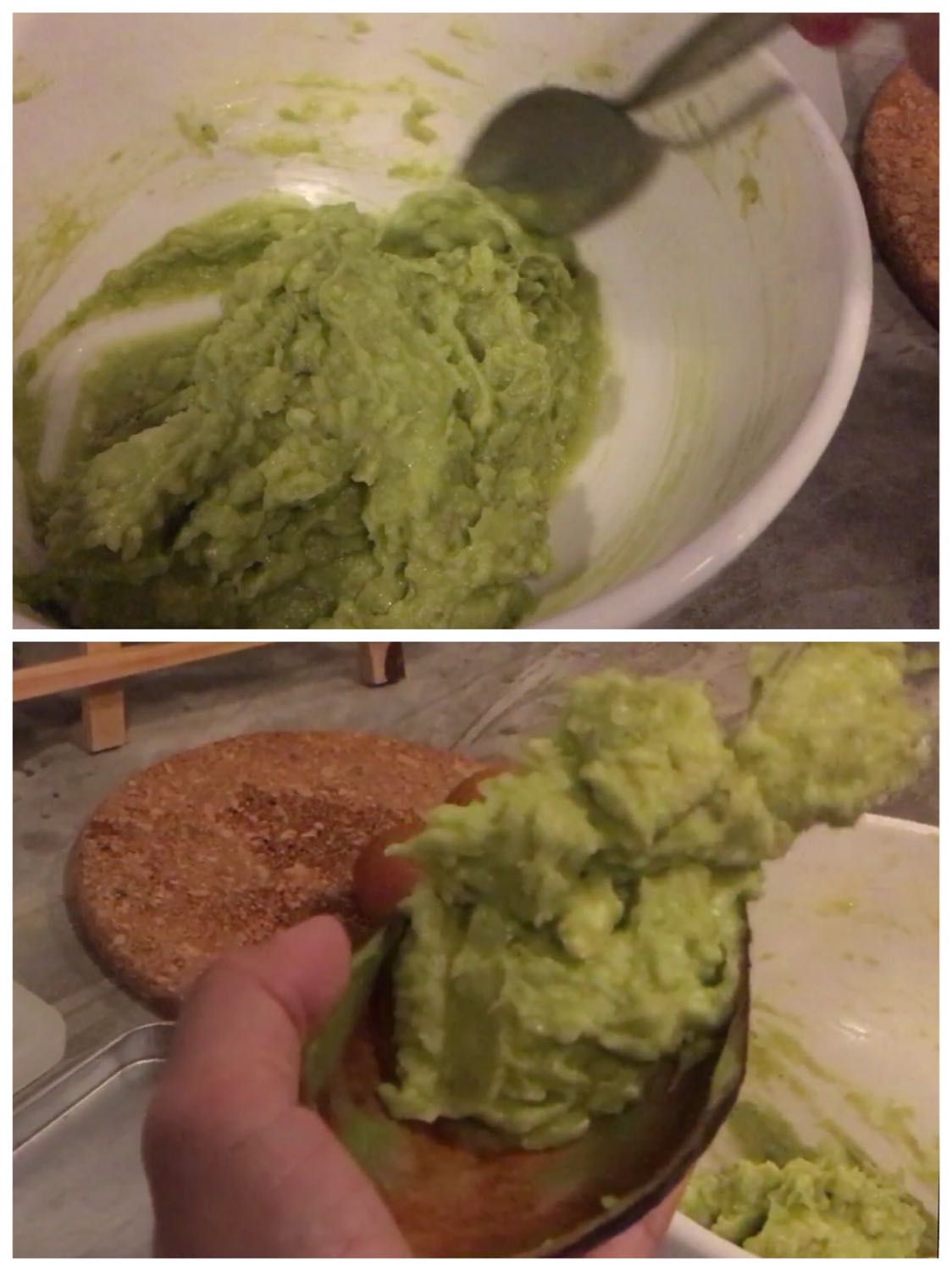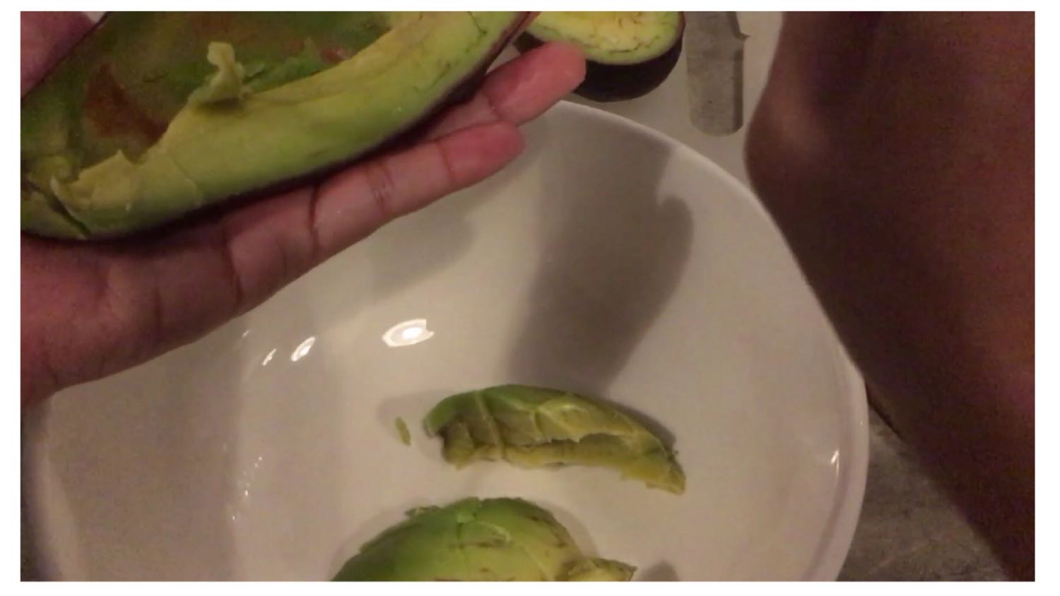 ผ่าครึ่งลูกอโวคาโด ตักเนื้อใส่ถ้วยเตรียมไว้