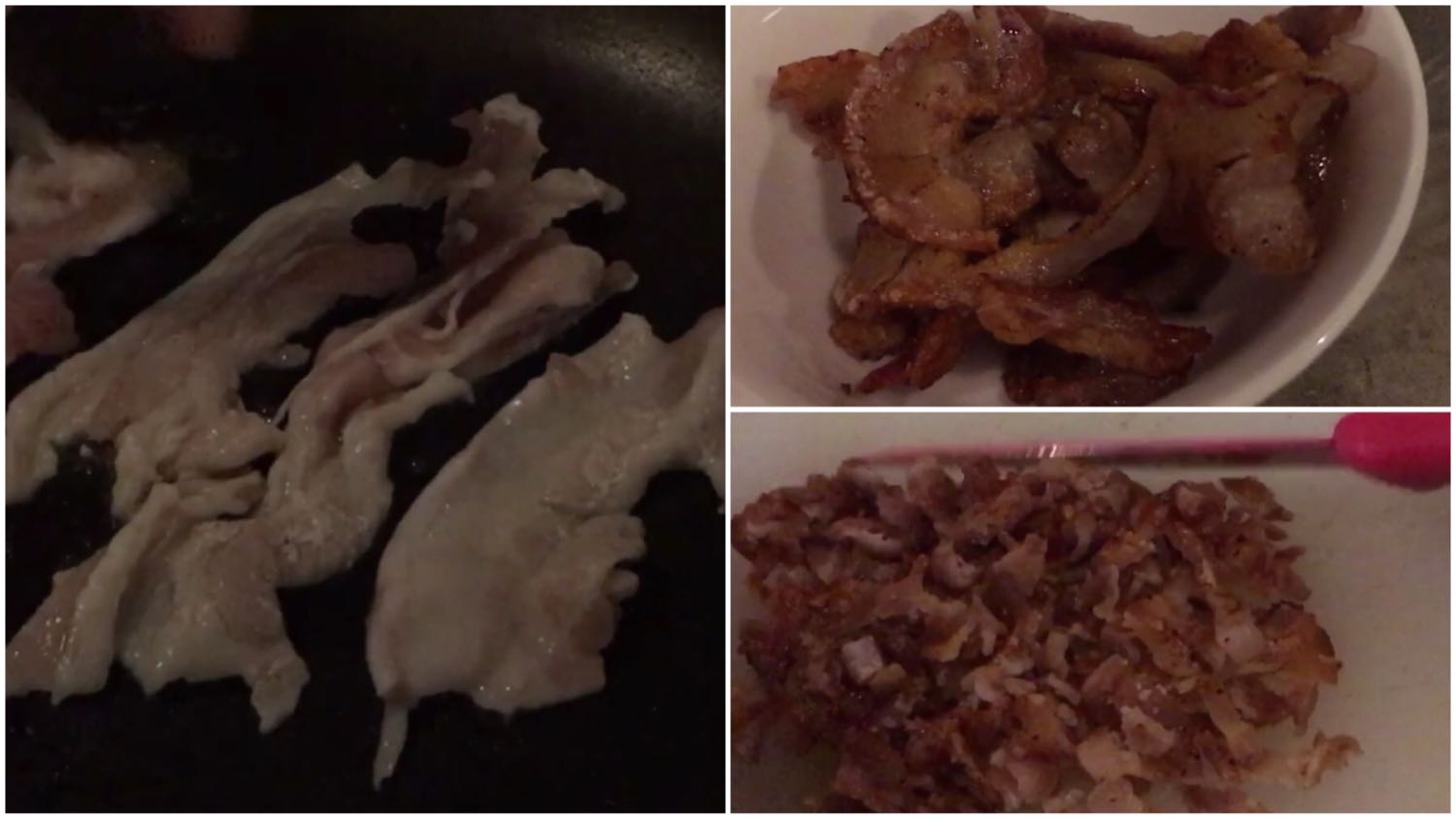เอาเบคอนมาทอดให้แห้งกรอบและหั่นเป็นชิ้นเล็กๆ เตรียมไว้จัดจาน