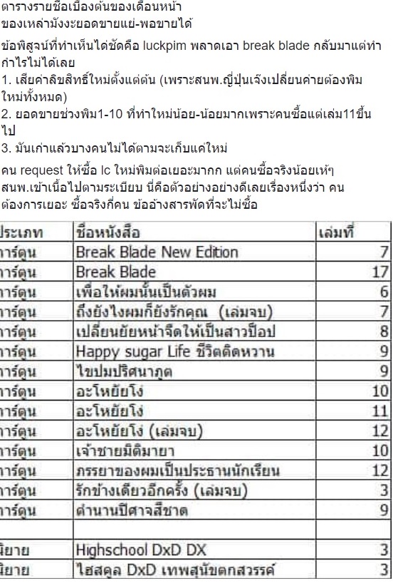 1.คือผมได้ยินเขาบอกมาว่าหนังสือพวกนี้ขายไม่ดี อันนี้ผมไม่แน่ใจว่าจริงเหรอ? หลายเรื่องดังนี่นาโดยเฉพาะเรื่องdxd แต่เขาดันบอกว่านี่คือรายชื่อ