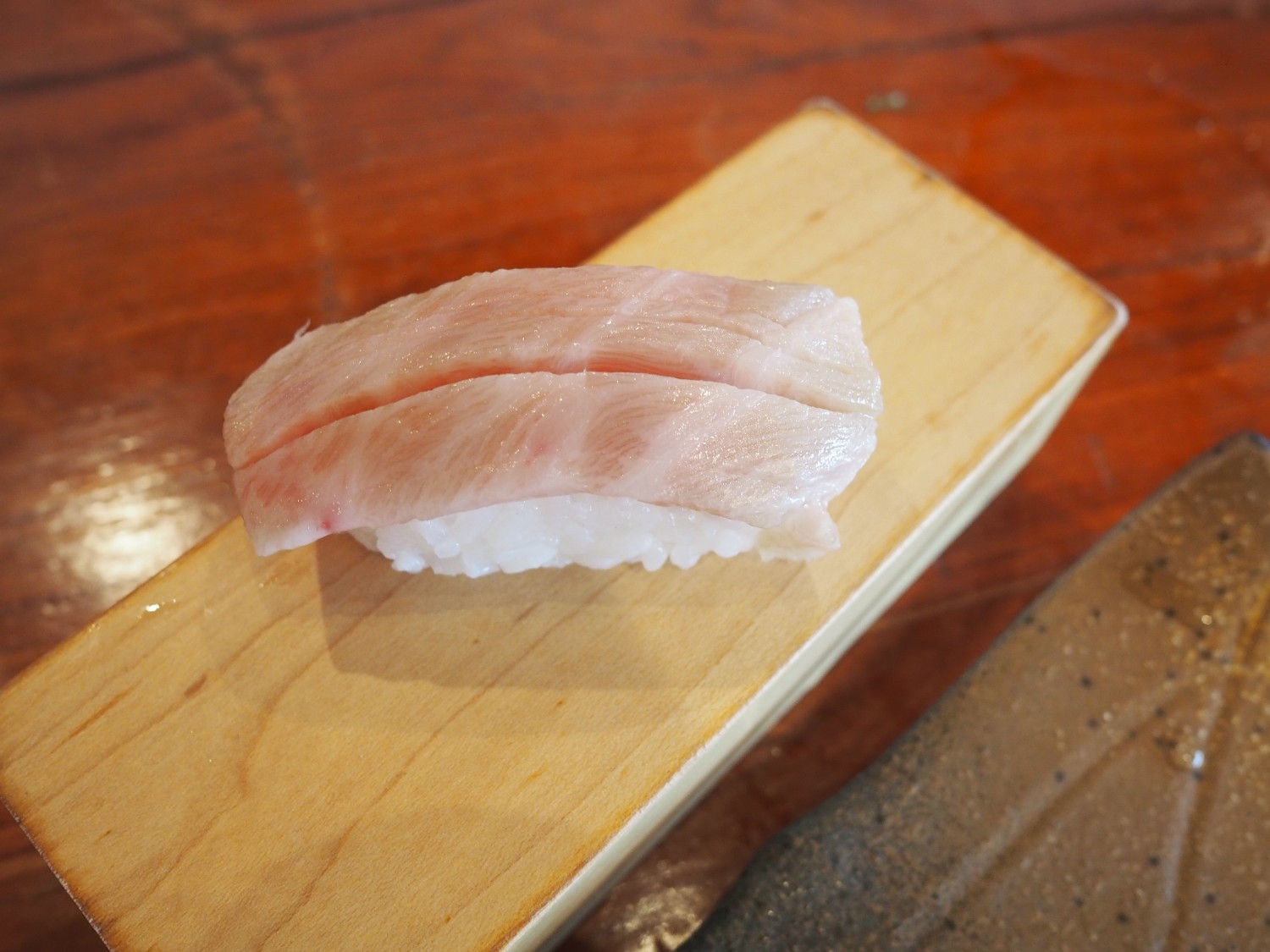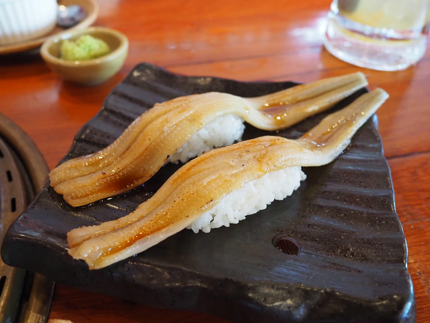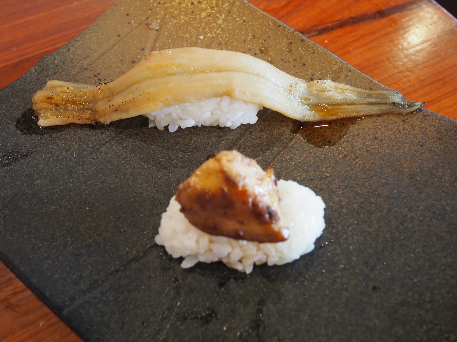 เมนูแรก อะนาโงะ หรือปลาไหลทะเล เสิร์ฟแบบยกตัว 1 เสิร์ฟ มี 2 คำ (เฉพาะเมนู 999 บาทลงไปร้านจะเสิร์ฟ 2 ที่ครับ) ค่อนข้างงงเหมือนกันว่าทำไมอะนาโงะยกตัวถึงอยู่ราคา 999 บาท เพราะถ้าหากไปทานซูชิที่ญี่ปุ่น เมนูนี้ราคาพอ ๆ กับโอโทโร่เลย ร้านเผามากำลังดีไม่สุกเกินไป พรมซอสหวานมานิดหน่อยกำลังสวย รสออกหวานน่อย ๆ ข้าวให้เยอะพอสมควร แต่ก็เท่า ๆ กับเวลาที่เค้าทำอะลาคาร์ทนั่นแหละ