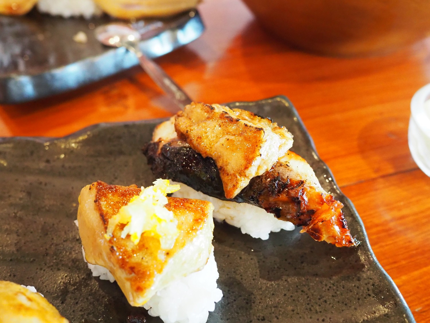 มาถึงทางของย่างบ้าง ไฮไลท์อยู่ที่ วากิวยากิสุกี้ยากี้ คือการเอาน้ำสุกี้เข้ามข้นมาราดบนเนื้อวากิว เพื่อย่างแล้วไปจิ้มกับไข่ดิบญี่ปุ่นที่ใส่ในซอสสุกี้อีกอะแหละให้ความรู้สึกกินสุกี้ญี่ปุ่นแต่หอมการย่าง ผมชอบเมนูนี้มาก ๆ ปกติสั่งอะลาคาร์ทกินก็ 390 บาทแล้ว วันนี้เลยจัดไปเน้น ๆ 3 ถาด