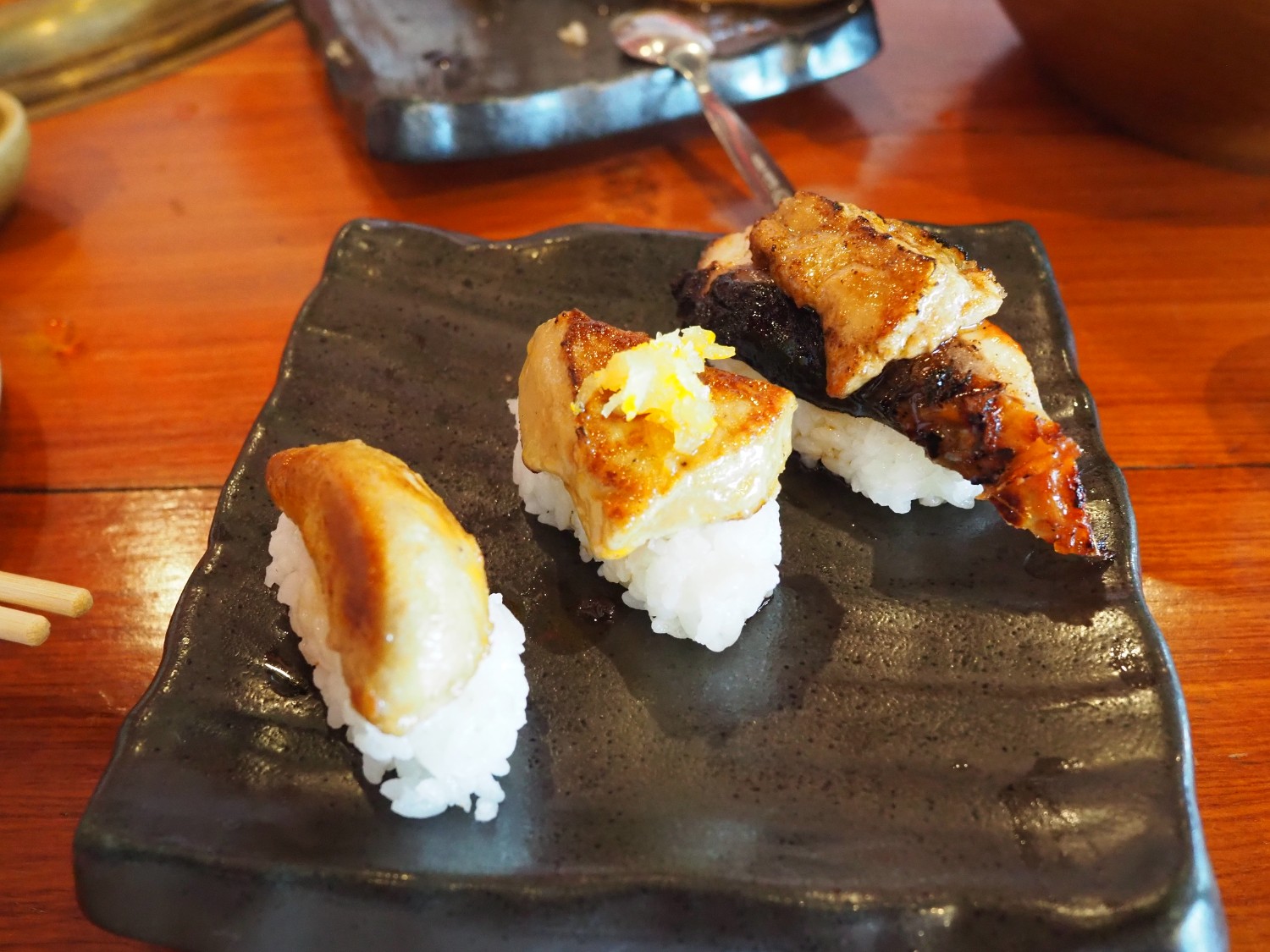 เซ็ทฟรัวกราส์แบบ 3 คำ มีฟรัวกราส์เปล่า ๆ อีกคำท็อปด้วยผิวส้มยูสึ คำสุดท้ายมีอูนางิด้วย