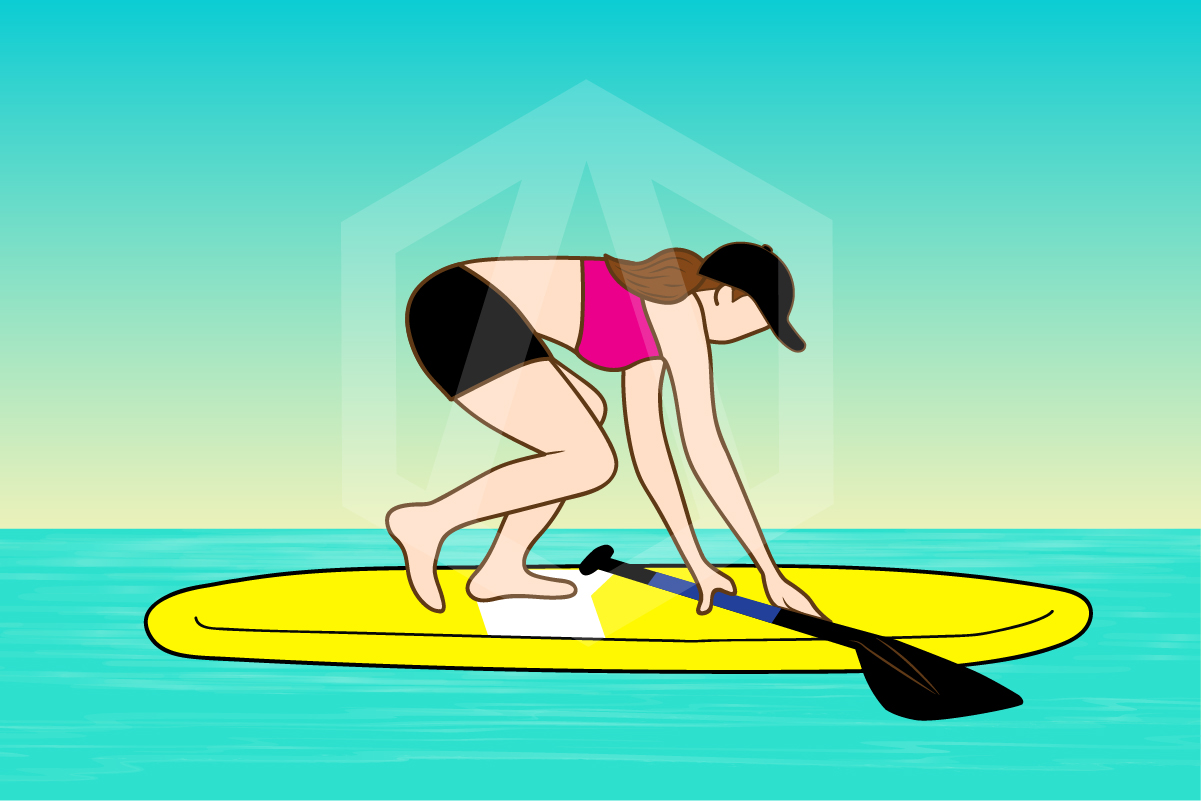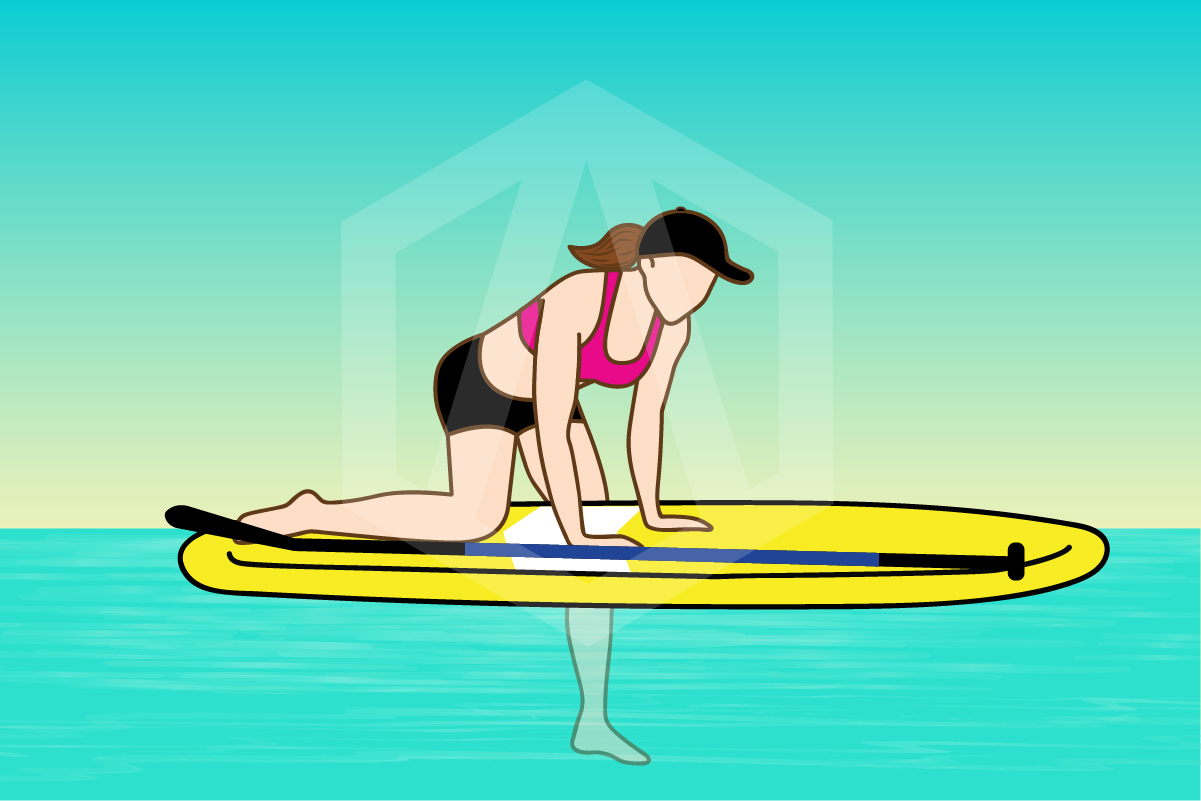 2. สำหรับมือใหม่ควรเริ่มการพายด้วยท่าคุกเข่า ซึ่งเป็นท่าที่คุณสามารถต่อยอดไปเป็นท่ายืนได้ง่ายที่สุด โดยในท่าคุกเข่านี้คุณสามารถพายไปได้เรื่อยๆ จนมั่นใจและพร้อมสำหรับการยืน แต่เราแนะนำว่า่ให้พายออกจากฝั่งไประดับนึง ให้เลือกยืนในจุดที่ไม่มีสิ่งกีดขว้างเผื่อสำหรับกรณีที่คุณพลาดล้มลงมาจะได้ไม่เป็นอันตราย