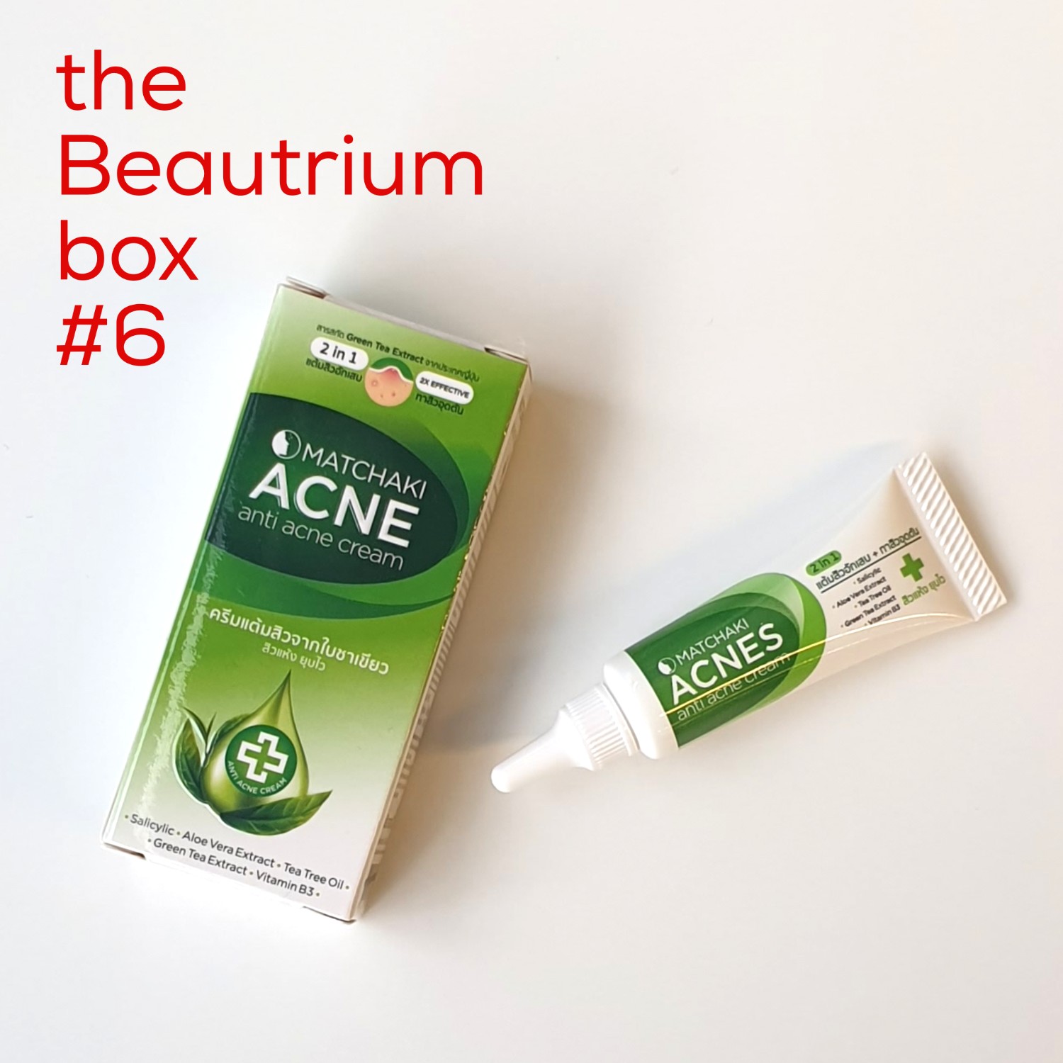 MATCHAKI ACNES anti acne cream 2in 1 แต้มสิวอักเสบ + ทาสิวอุดตัน มีสารสกัดจากใบชาเขียวญี่ปุ่น และการทำงานของ Salicylic Acid ทำให้จัดการปัญหาสิวได้เร็วและมีประสิทธิภาพยิ่งขึ้น ไม่ทำให้ผิวแห้งลอกด้วย และนอกจาก Green tea Extract และ Salicylic Acid จะช่วยเรื่องสิวทุกรูปแบบแล้ว ยังรักษาแผลจากสิวไปในตัว ด้วย Vitamin B3 เข้มข้น ที่สำคัญลดโอกาสการเกิดสิวซ้ำอีกด้วย