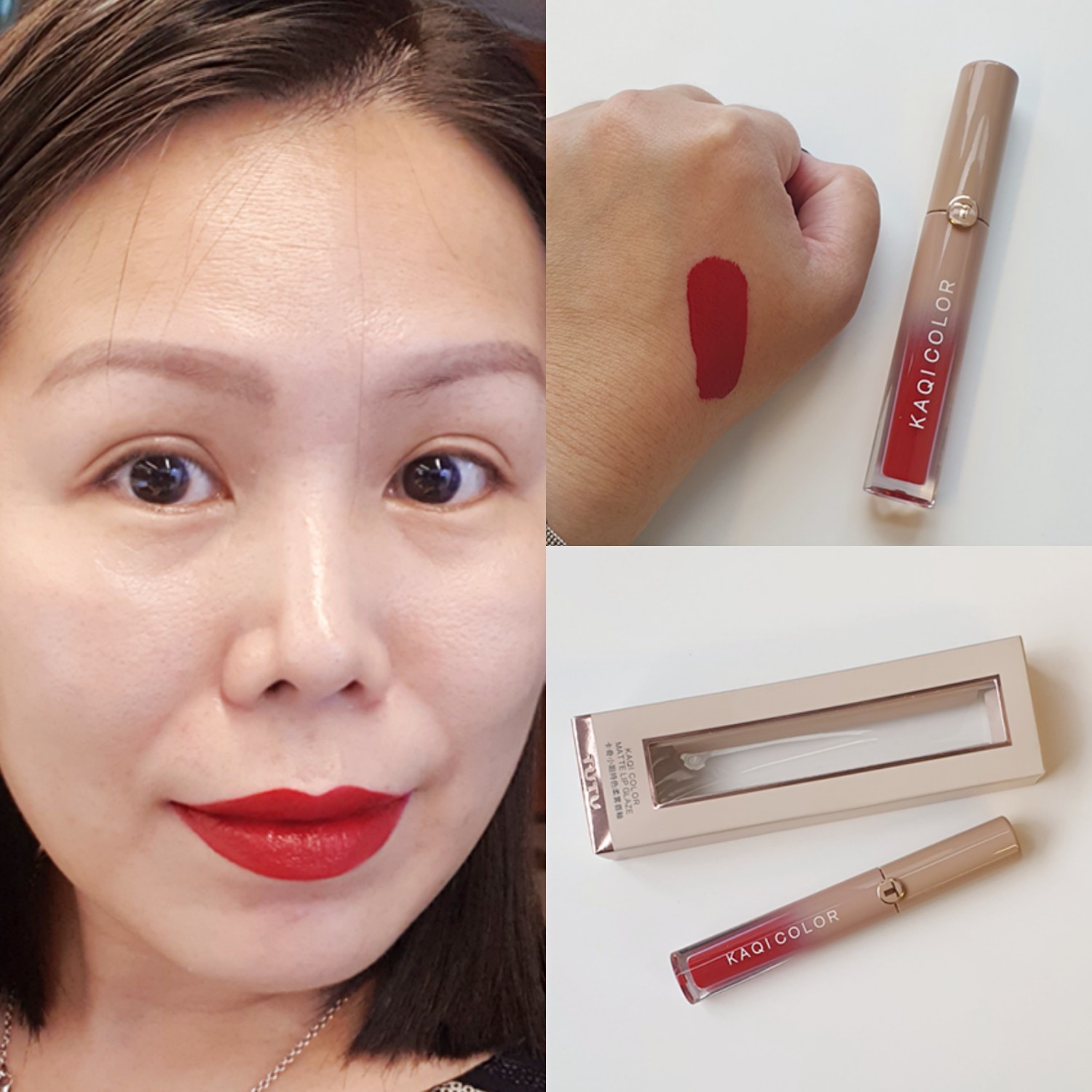 TUTU KAQI COLOR MATTE LIP GLAZE สี 107 ลิปจิ้มจุ่มสีแดง แพคเกจสีสวย ที่แบบแดงมากแม่ เป็นลิปแมตที่ทาแล้วปากไม่แห้ง ไม่ตกร่อง เกลี่ยง่ายมาก ปาดทีเดียวอยู่ พิกเมนท์แน่นมากเวอร์ ไม่รู้สึกเหนอะหรือหนักปากเวลาที่ลิปอยู่บนปากเลย แอบขำตัวเองนะ ไม่แต่งหน้า แต่กล้าทาลิปแดงขนาดนี้ ปากเด่นลอยมาแต่ไกลเลยค่ะ กินข้าวกินน้ำแล้วสีปากก็ยังเหลือเยอะอยู่ ถือว่าผ่านค่ะ