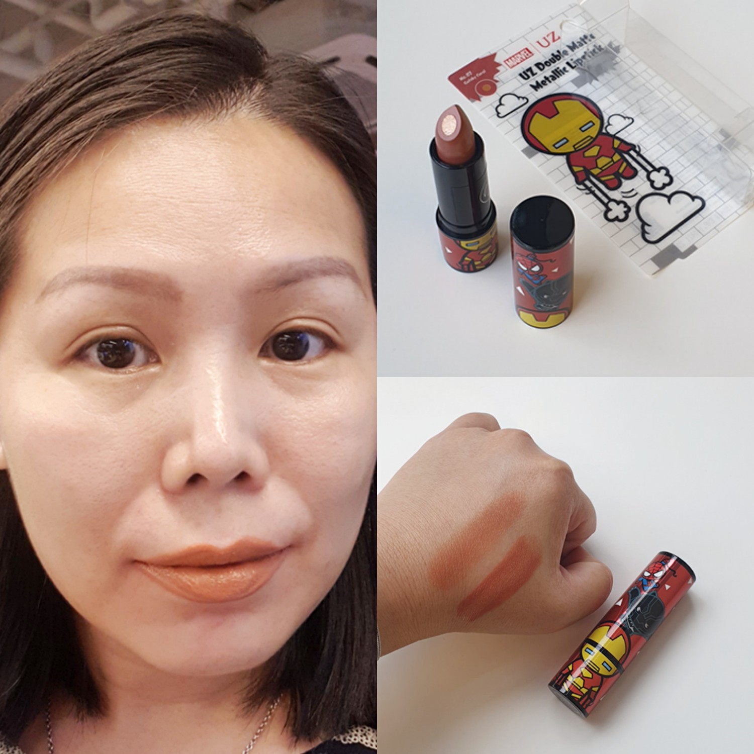 มาต่อกันที่แท่งที่ 3 ค่ะ UZ KAWAII DOUBLE MATTE METALIC LIPSTICK สี #02 Gatsby Coral ทุกคนมันเป็นลิปที่น่ารักมากกกกก มีความตะมุตะมิในความ Marvel ทำเป็น 2 สี เป็นแบบเมทัลลิคตรงกลาง เพื่อเพิ่มความแวววาว เหลือบวิบวับ แปลกใหม่ดีค่ะ ทาแล้วรู้สึกทาง่าย เกลี่ยง่าย เนื้อค่อนข้างดีเลยค่ะ สีสวย ไม่ถึงกับเมทัลลิคมาก