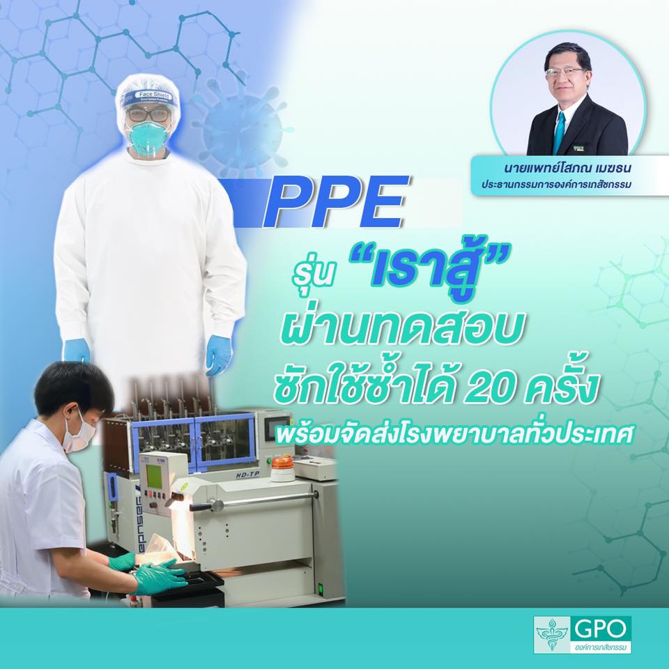 ชุด PPE แบบเสื้อคลุมแขนยาวกันน้ำชนิดซักใช้ซ้ำได้ (Reusable Isolation Gown) รุ่น “เราสู้” ที่ได้ตัดเย็บเป็นชุด และผ่านการตรวจมาตรฐานจากศูนย์วิเคราะห์ทดสอบ สถาบันพัฒนาอุตสาหกรรมสิ่งทอเรียบร้อย และดำเนินการตรวจรับแล้ว จำนวน 46,898 ชุด และได้เริ่มทยอยจัดสรรและจัดส่งให้กับโรงพยาบาลและหน่วยงานต่างๆ ทั่วประเทศแล้ว จำนวน 41,950 ชุด ส่วนที่เหลือศูนย์ปฏิบัติการกระจายเวชภัณฑ์ในภาวะโควิด-19 จะดำเนินการจัดสรร กระจายให้โรงพยาบาลต่างๆต่อไป โดยชุด PPE รุ่น “เราสู้” นี้ สามารถซักและใช้ซ้ำได้ 20 ครั้ง ทำให้คาดว่าจะสามารถนำมาใช้ทดแทน ชุด PPE ชนิดที่ใช้ครั้งเดียวได้มากกว่า 937,960 ชุด / ครั้ง