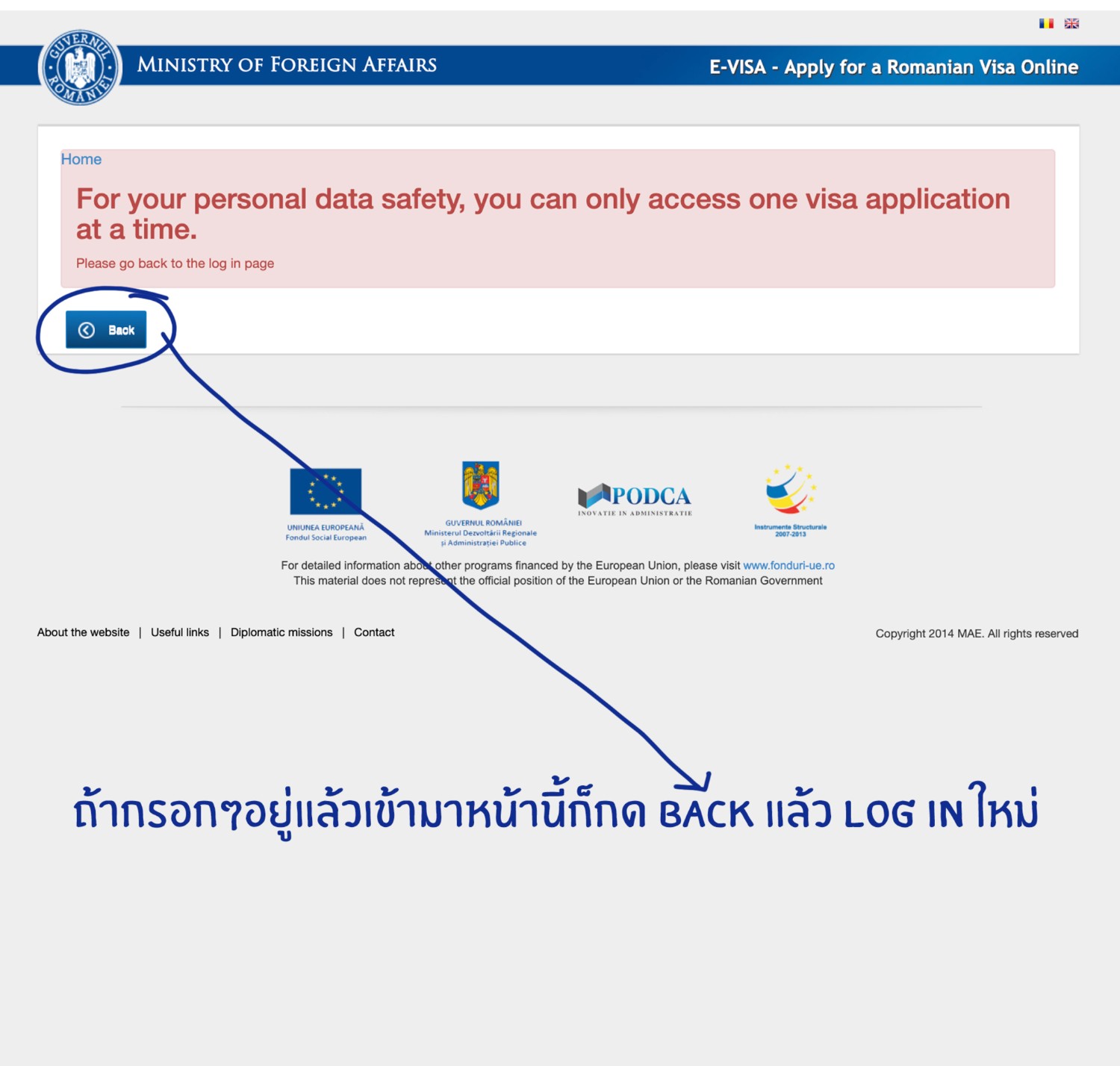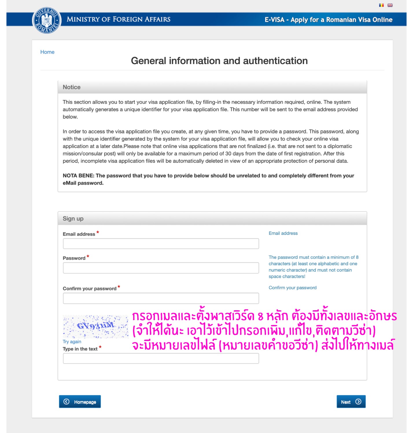 2. สมัครขอวีซ่าด้วยการกรอกแบบฟอร์มใบสมัครที่หน้าเว็บ http://evisa.mae.ro/home *เรามีรูปตัวอย่างการกรอกให้ในตอนท้ายนะคะ*