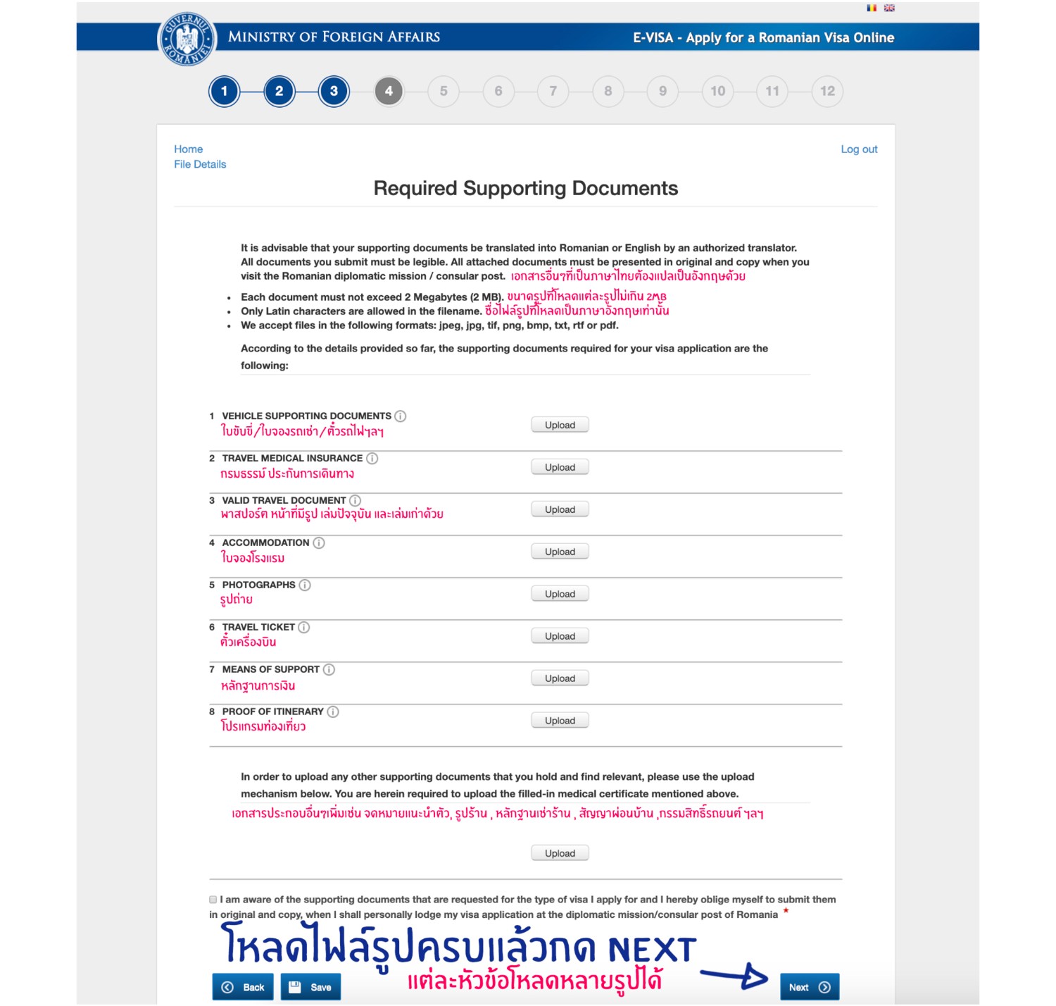 - ถ้าเป็นภาษาไทยต้องแปลเป็นภาษาอังกฤษด้วย *อันนี้มีกำหนดไว้ แต่เราไปเจอเจ้าหน้าที่ชาวโรมาเนียที่อ่านไทยได้*