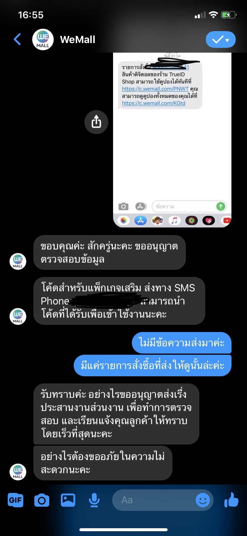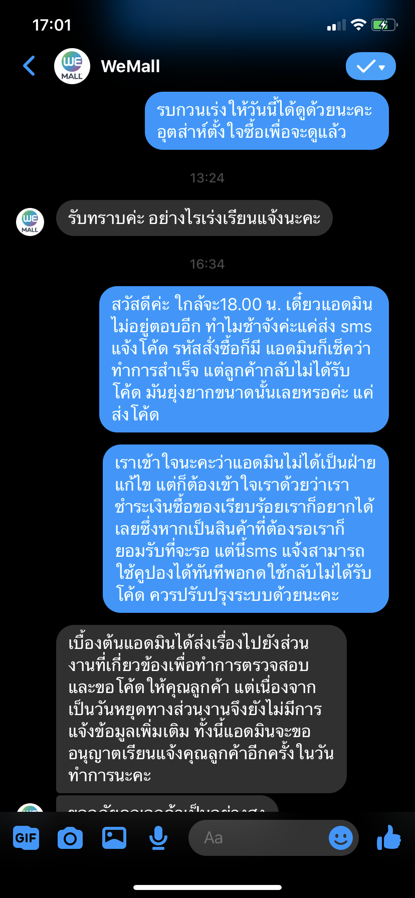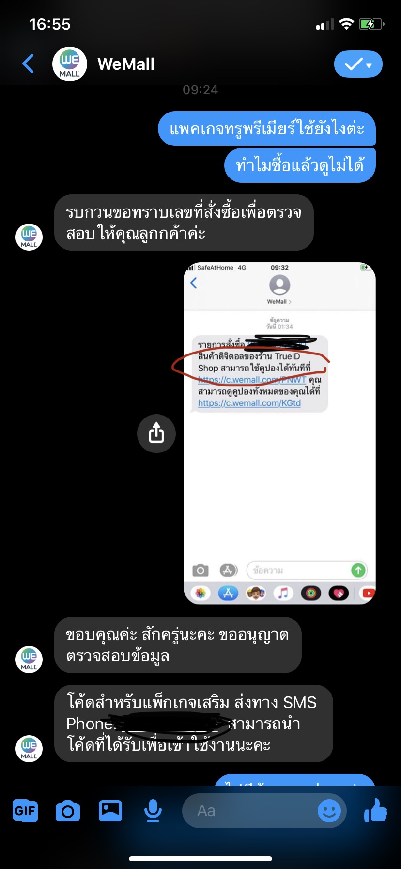 เราซื้อแพคเกจดูบอลพรีเมียร์ trueID ทาง wemall แต่กลับไม่ได้รับโค้ด จะโทรสอบถามทาง Call center ก็ทำการแค่จันทร์ถึงศุกร์ เลยทักไปทางเพจ แอดมินให้เราส่งรายการคำสั่งซื้อไปตั้งแต่ 9 โมงกว่าๆ จนป่านนี้จะยังไม่รับโค้ดเลย ทำไมมันช้าจังทั้งที่ sma แจ้งคำสั่งซื้อแจ้งว่าสามารถใช้คูปองได้ทันที แต่เราใช้ไม่ได้ มีใครเคยซื้อแล้วเป็นแบบเรามั้ง เศร้าเลย แอดมินแจ้งว่าต้องติดต่อส่วนนั้นวันทำการเนื่องจากเป็นวันหยุด......??????? เข้าใจค่ะว่าเป็นวันหยุดแต่คุณเป็นบริษัทซื้อของออนไลน์ ขายของได้ทุกวันน่าจะมีพนักงานคอยบริการลูกค้าในวันหยุดด้วย เวลาลูกค้ามีปัญหากลับต้องรอ เวลาตัดเงินซื้อของก็ทำการได้ทันที เพิ่งเคยใช้บริการครั้งแรกแย่มากเลยค่ะ