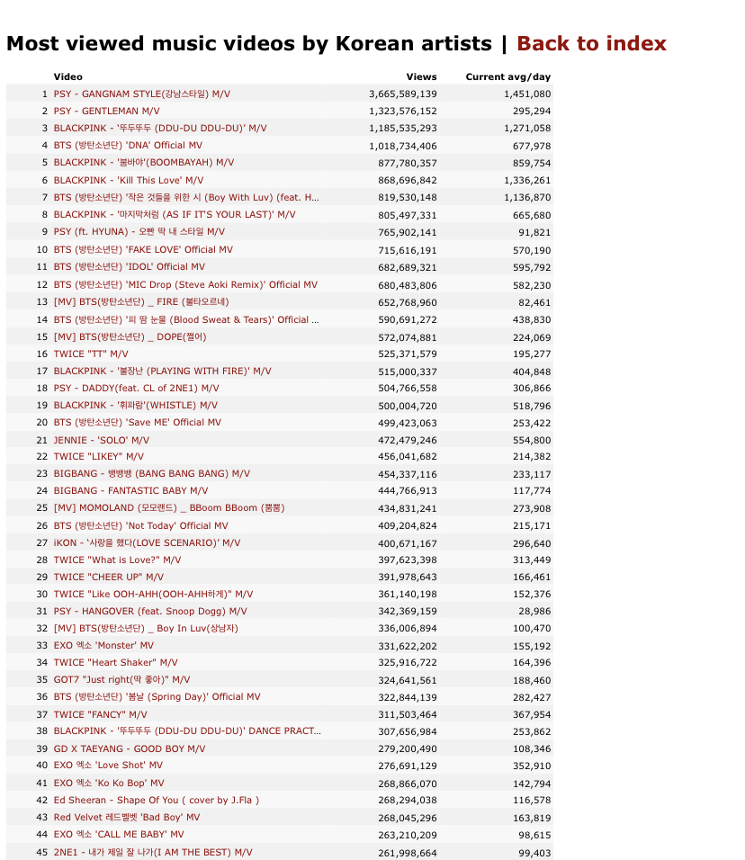 Youtube นี่ แพลตฟอร์มที่คนใช้มากที่สุดในโลกเลยมั้ง เข้าถึงง่ายทุกที่ทั่วโลก ยอดวิวเยอะแปลว่าพับลิคแน่ๆ เกาหลีก็ใช้ยูทูปกันเยอะนะไม่งั้นไม่ลงเอมวีในยูทูปหรอก ถ้ายอดวิวเยอะแปลว่าเพลงนั้นดังระดับอินเตอร์แน่นอน แต่บางเพลงที่ดังเน้นในเกาอย่างเพลงของสายศิลปิน ยอดวิวอาจจะไม่ได้เยอะมาก อันนี้ต้องดูชาร์ตเกาหลีร่วมด้วย