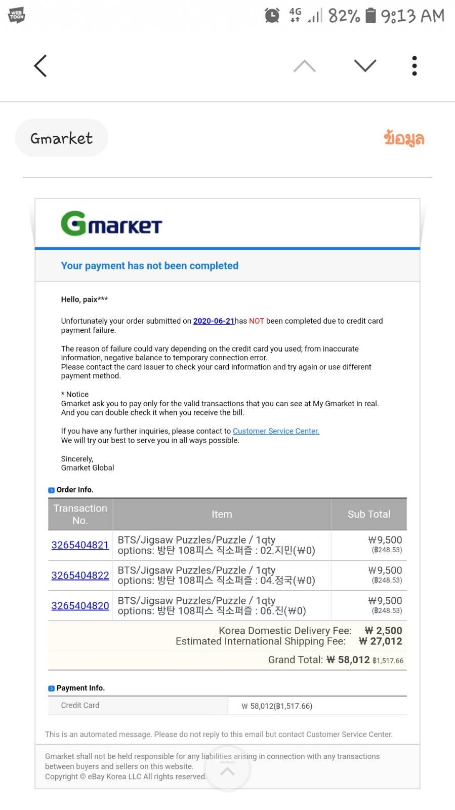 สวัสดีค่ะ เราเพิ่งเคยสั่งของในGmarketครั้งเเรกนะคะ คือเมื่อวานเราสั่งของไป2ชิ้นจ่ายเงินไปเรียบร้อยเเล้ว พอผ่านมาสักพักมีเมลส่งมาว่าการจ่ายเงินของเรายังไม่เสร็จท