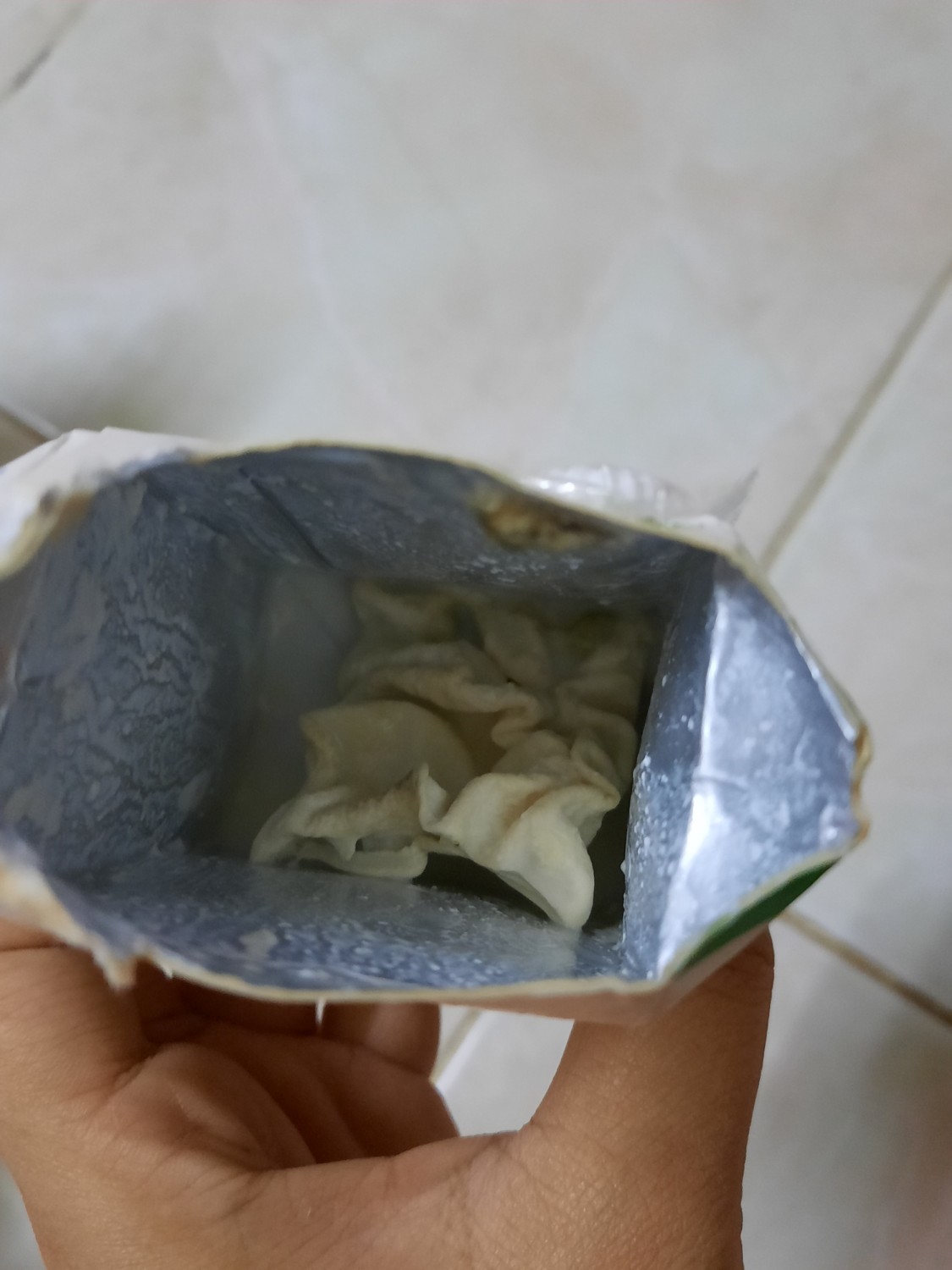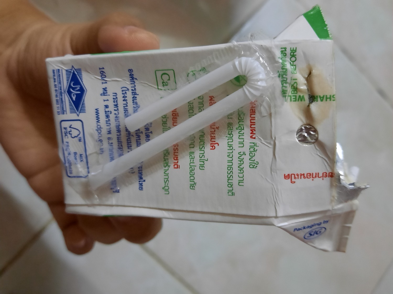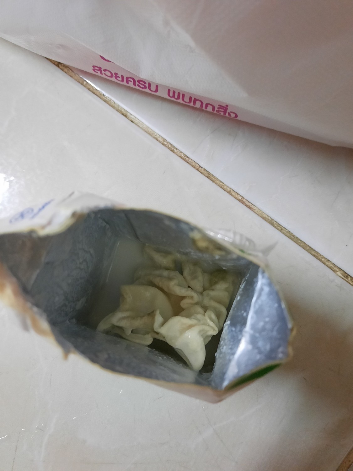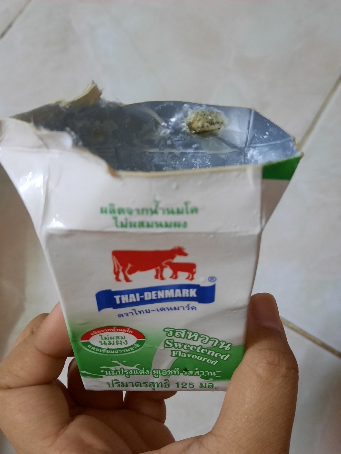 พอดีเราซื้อนมเป็นเเพคมาจากซูเปอร์มาเก็ตแห่งหนึ่งเมื่อต้นเดือนพอเราจะเอาไปเเช่ตู้เย็นเเล้วเจอมันผิดปกติเราเลยลองกรรไกรตัดดูก็เจอสิ่งนี้ค่ะ ปกติเวลาเรากินนมเราจะเเช่ทีละกล่องเลยไม่ได้สังเกตค่ะ