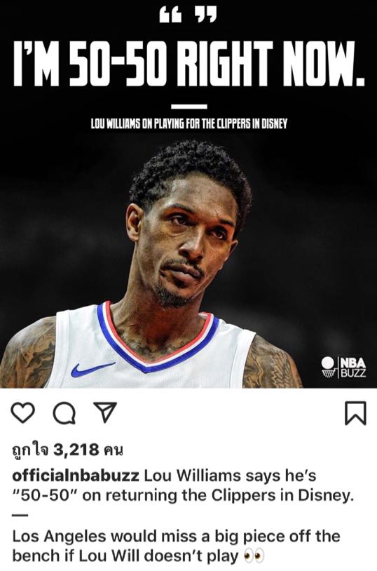 LOU WILLIAMS อาจจะไม่ร่วมทีม CLIPPERS ไป DISNEY (โอกาสขณะนี้ 50-50)