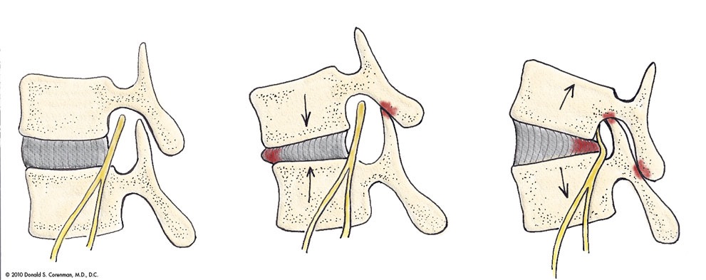 ทีนี้ พอหมอนรองกระดูข้อนั้นๆ เสื่อมลง พูดง่ายๆ ก็คือ มันสึก แตกออก ทำให้กระดูกสองชื้นที่หมอนตัว