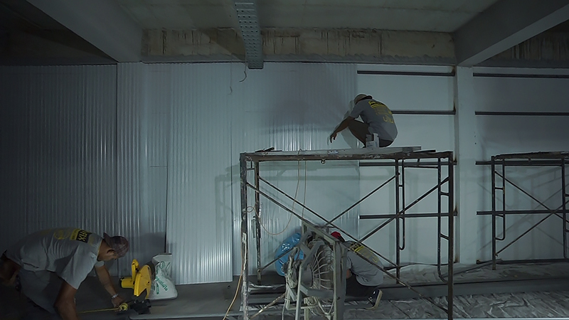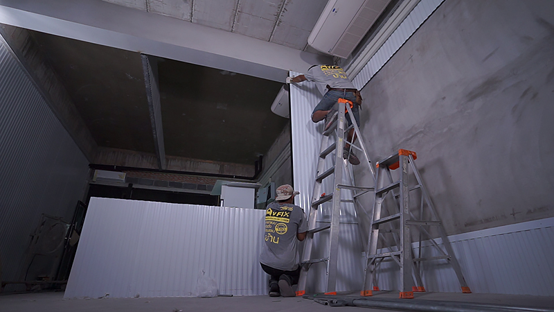วันที่ 5 จะเป็นงานติดตั้งโครงเคร่าเหล็กยึดผนัง พร้อมกับติดตั้งแผ่นเมทัลชีท ใช้เวลาประมาณ 2-3 วัน