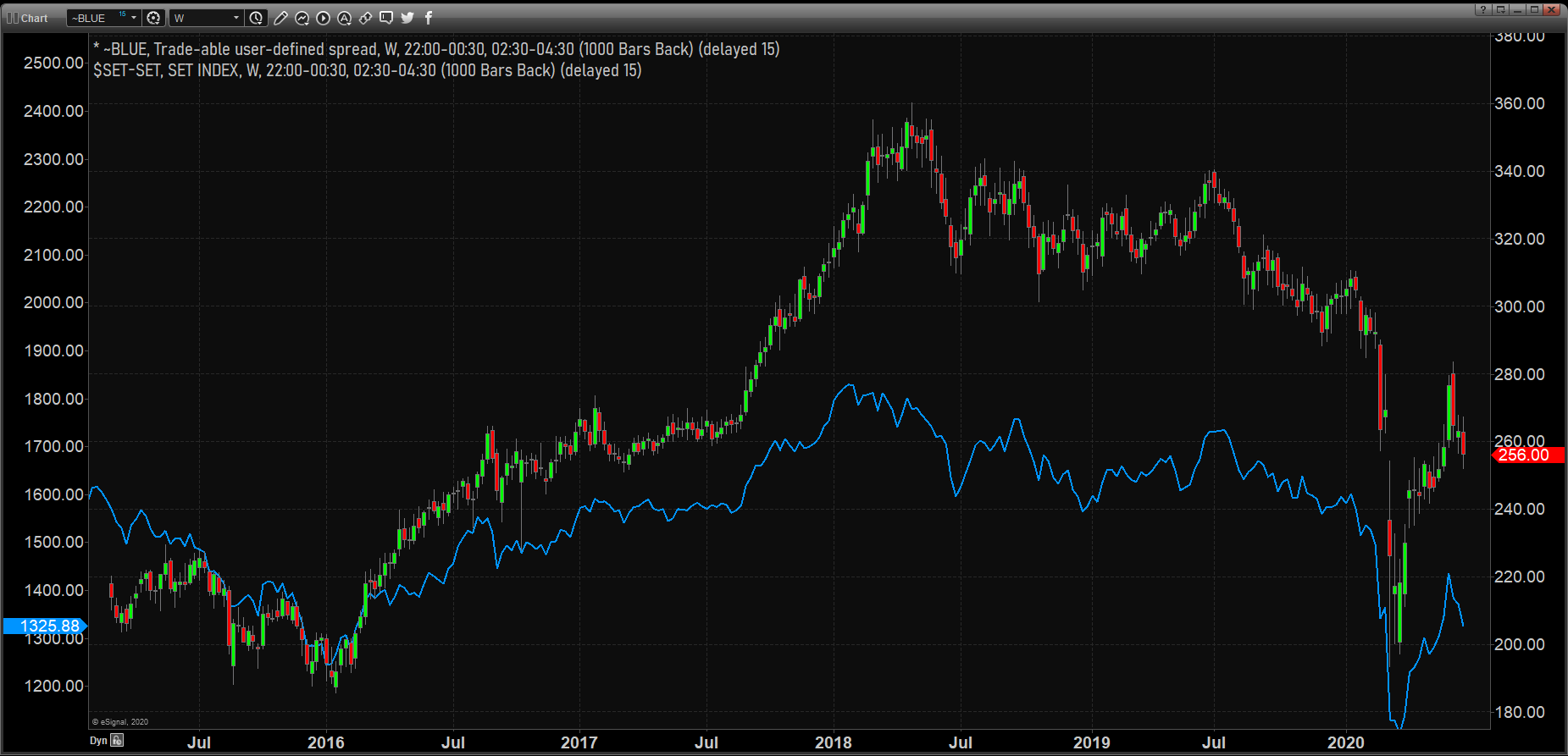 (Composite index (1 CPN, 1 CPALL, 2*PTT and 3*BDMS) นํ้าหนักเท่ากันในหุ้นแต่ละตัว VS. 615 หุ้นในดัชนี SET(เส้นสีฟ้า)