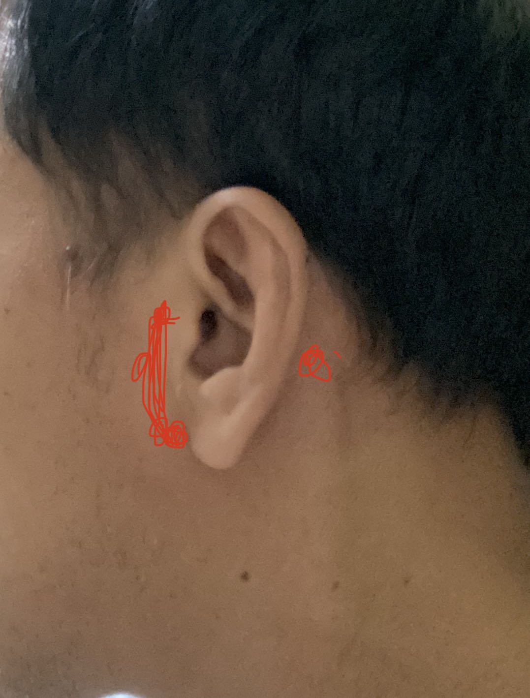 อาการปวดหู ไม่ทราบสาเหตุ กดเจ็บมาถึงด้านนอก (ตามรูป)อาการอื้อบางเล็กน้อย
