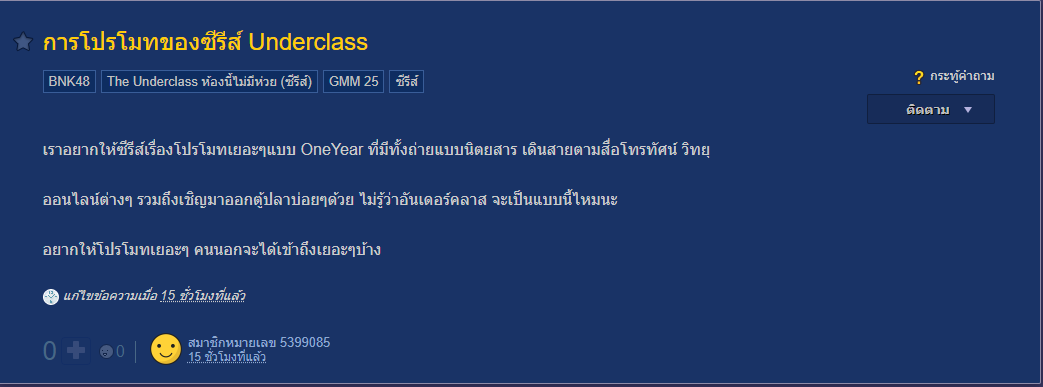 ผมรู้ครับว่าเมมเบอร์คนใหนที่เขาพูดถึง น้องพูดคือน้องไม่ได้จะบอกว้าไม่ชอบแต่น้องบอกว่าไม่ใช่แนวตัวผมก็จำคำพูดไม่ได้แต่อาจจะมีคำว่าไม่ชอบหรือไม่มีก็ขออภัยที่จำคำพูดไม่ได้และผมขอไม่เอ๋ยถึงเขาจำวัน live ที่พูดไม่ได้ด้วยนั้นละแต่อย่าไปขุดเลยไม่ไม่ได้มีอะไรมากมายน้องก็แค่พูดขึ้นมาแปปเดียวเองไม่ได้อธิบายอะไรขนาดนั้นเพราะว่าวันนั้นแฟนคลับถามถึงคาแรกเตอร์เขา และอาจจะสวนทางคาแรกเตอร์เขามั้ง รอผลงานดีกว่าว่าน้องๆทำได้ดีแค่ใหน ชอบไม่ชอบมันไม่ได้เป็นตัวตัดสินคนอื่นว่าเหมาะไม่เหมาะกับการรับบทรอดูไปเถอะ ถ้าคิดไม่ออกก็แนวเดียวกับที่เฌอเคยบอกว่าไม่ค่อยชอบคาแรกเตอร์พี่เพชรนั้นละอารมณ์เดียวกัน