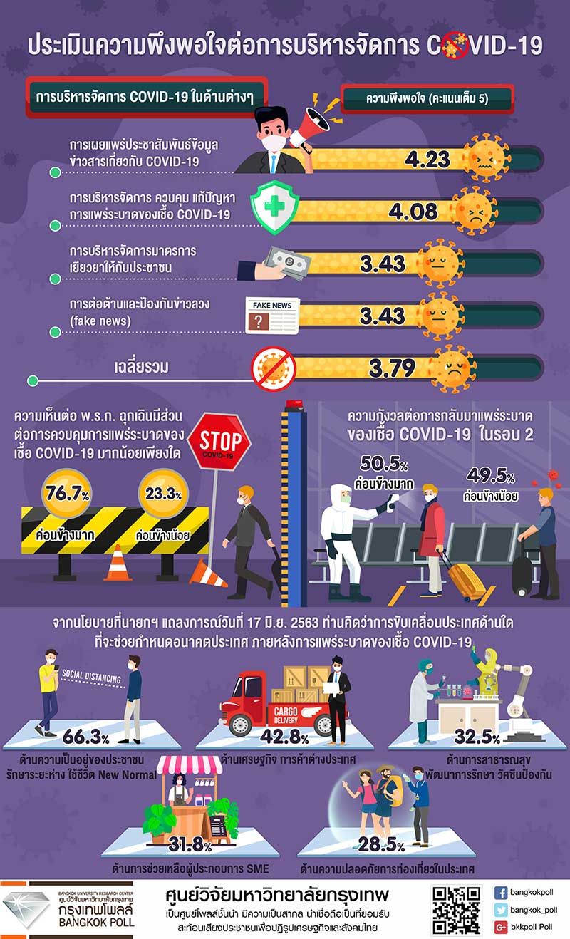 27 มิถุนายน 2563 กรุงเทพโพลล์โดยศูนย์วิจัยมหาวิทยาลัยกรุงเทพ ดำเนินการสำรวจความคิดเห็นประชาชน เรื่อง “ประเมินความพึงพอใจต่อการบริหารจัดการ COVID-19” โดยเก็บข้อมูลกับประชาชนจากทุกภูมิภาคทั่วประเทศจำนวน 1,214 คน พบว่า.....💜