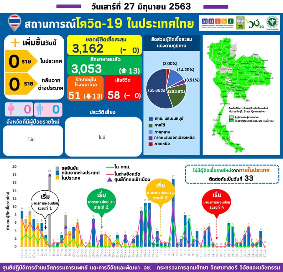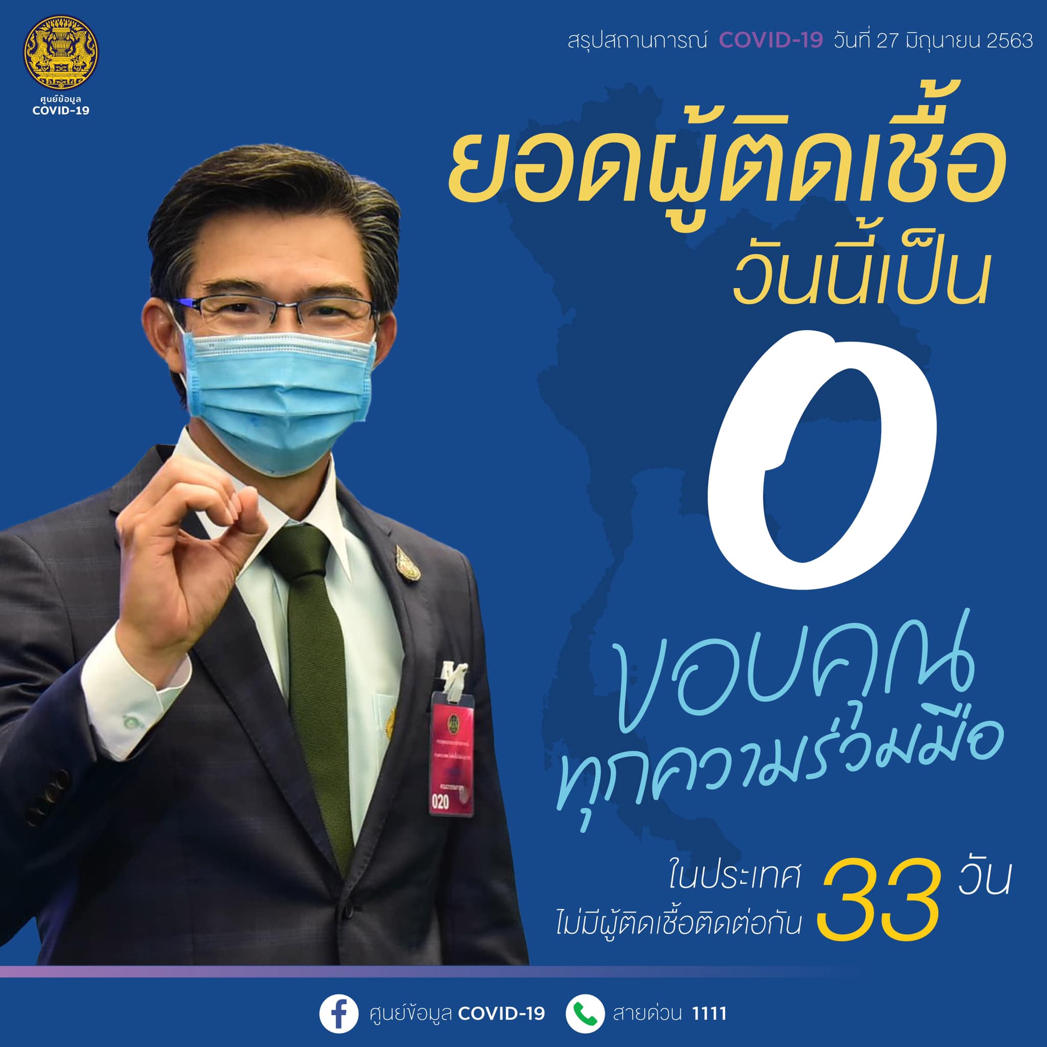 27 มิถุนายน 2563 นพ.ทวีศิลป์ วิษณุโยธิน โฆษกศูนย์บริหารสถานการณ์การแพร่ระบาดของโรคติดเชื้อไวรัสโคโรน่า2019 (โควิด-19) หรือ ศบค. แถลงว่า สถานการณ์การแพร่ระบาดในประเทศไทย วันนี้ ไม่พบตัวเลขผู้ติดเชื้อรายใหม่ภายในประเทศ และผู้ติดเชื้อในสถานที่กักตัวของรัฐ ทำให้มียอดผู้ป่วยสะสม 3,162 ราย หายป่วยสะสม 3,050 ราย ซึ่งไม่มีรายงานผู้เสียชีวิตเพิ่มเติม ทำให้ยอดสะสมคงที่ 58 ราย และไม่มีผู้ป่วยติดเชื้อภายในประเทศติดต่อกัน 33 วัน