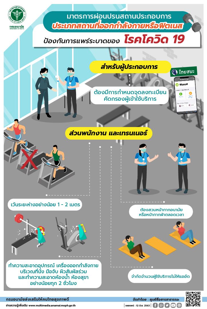 กรมอนามัยแนะ มาตรการผ่อนปรนสถานประกอบการประเภทสถานที่ออกกำลังกายหรือฟิตเนส เพื่อป้องกันและลดการแพร่กระจายของเชื้อไวรัส Covid-19 และสุขภาพอนามัยที่ดีของทุกคน