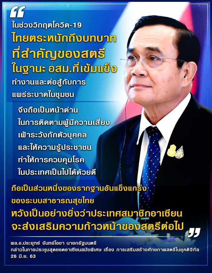นายกรัฐมนตรีชูบทบาทสตรี ร่วมต่อสู้โควิด - 19 ในฐานะ อสม. ที่เข้มแข็ง ในเวทีการประชุมผู้นำอาเซียนสมัยพิเศษ เรื่องการเสริมสร้างศักยภาพสตรีในยุคดิจิทัล ซึ่งเป็นหนึ่งในการประชุมนอกเหนือจากการประชุมสุดยอดอาเซียน ครั้งที่ 36 ผ่านระบบประชุมทางไกล เป็นการหารือร่วมกันเพื่อร่วมกันเสนอแนะแนวทางในการเสริมสร้างศักยภาพสตรี สนับสนุนบทบาทสตรีในการร่วมสร้างประชาคมอาเซียน