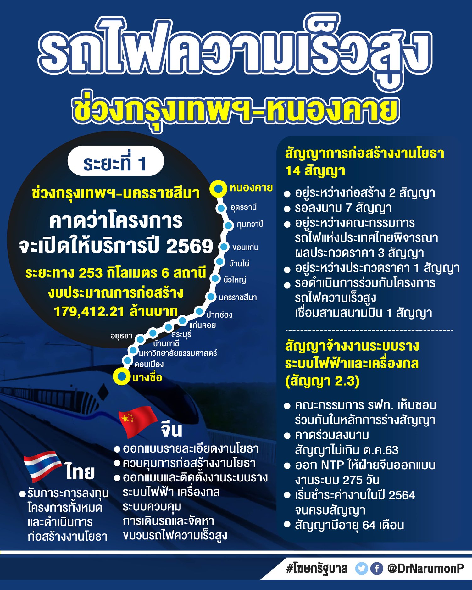 โครงการความร่วมมือระหว่างรัฐบาลไทยและรัฐบาลสาธารณรัฐประชาชนจีนในการพัฒนาระบบรถไฟความเร็วสูง เพื่อเชื่อมโยงภูมิภาคช่วงกรุงเทพฯ-หนองคาย (ระยะที่ 1 ช่วงกรุงเทพฯ-นครราชสีมา)เป็นการยกระดับให้ไทยเป็นศูนย์กลางการคมนาคมขนส่งของภูมิภาคอาเซียน โดยรถไฟความเร็วสูงช่วงกรุงเทพฯ-หนองคาย (ระยะที่ 1 ช่วงกรุงเทพฯ-นครราชสีมา)ระยะทาง 253 กิโลเมตร 6 สถานี ใช้งบประมาณการก่อสร้าง 179,412.21 ล้านบาท ฝ่ายไทยรับภาระการลงทุนโครงการทั้งหมดและดำเนินการก่อสร้างงานโยธาส่วนฝ่ายจีน ออกแบบรายละเอียดงานโยธา ควบคุมการก่อสร้างงานโยธา ออกแบบและติดตั้งงานระบบราง ระบบไฟฟ้า เครื่องกล ระบบควบคุมการเดินรถและจัดหาขบวนรถไฟความเร็วสูง โดยแบ่งสัญญาการก่อสร้างงานโยธาออกเป็น 14 สัญญา