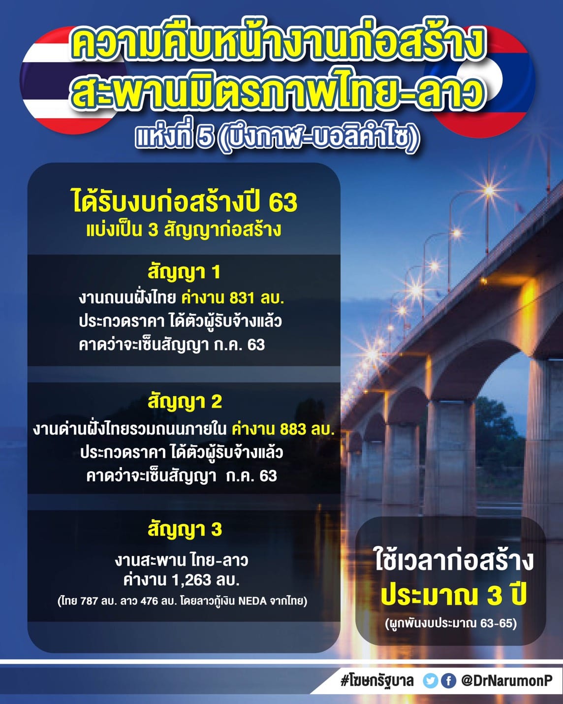 ความคืบหน้างานก่อสร้างสะพานมิตรภาพไทย-ลาว แห่งที่ 5 (บึงกาฬ-บอลิคำไซ) ทั้งนี้คาดว่าจะเริ่มดำเนินการก่อสร้างได้ครบทุกตอน ประมาณเดือนกันยายน 2563 โดยจะใช้เวลาก่อสร้าง ประมาณ 36 - 40 เดือน แล้วเสร็จประมาณปลายปี พ.ศ. 2566 โดยโครงการเริ่มเมื่อวันที่ 4 มิถุนายน 2562 ครม. อนุมัติในหลักการให้กรมทางหลวงกระทรวงคมนาคมดำเนินการ ก่อสร้างสะพานมิตรภาพไทย-ลาว แห่งที่ 5 (บึงกาฬ - บอลิคำไซ) วงเงินลงทุนทั้งสิ้น 3,930 ล้านบาท (ค่าก่อสร้างและค่าจ้างควบคุมงาน) เป็นเงินที่ฝ่ายไทยรับผิดชอบ 2,630 ล้านบาท ฝ่าย สปป.ลาว รับผิดชอบ จำนวน 1,300 ล้านบาท