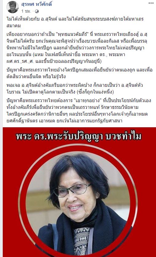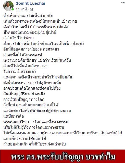 พระสายป่า อรัญวาสี สายบ้านคามวาสี ทั้งสองสายก็ปฏิบัติเพื่อให้พ้นทุกข์ได้เหมือนกัน ที่คุณยายว่ามาก็ถูกไม่ได้เถียง พระสงฆ์สาวกปฏิบัติให้บริสุทธิ์บริบูรณ์ตามประสงค์ชองการบวชได้ แต่ท่านคงต้องขอกลับไปเกิดอยู่ในสมัยพุทธกาลโน้น ไม่ใช่ปัจจุบันกาลนี้ พระพุทธองค์ก่อนออกบวชก็ทรงเรียนจบ ๑๘ ศาสตร์สาขาวิชา หลังการตรัสรู้ ก็ทรงนำความรู้นั้นมาประยุกต์โปรดพุทธบริษัทตามอุปนิสัยของผู้นั้นๆ ปัจจุบันพระสงฆ์จะเรียนรู้ศาตร์อื่น ๆ ของโลกถือเป็นส่วนแห่งปัญญาบารมีเพื่อใช้โปรดพุทธบริษัทตามโลกแห่งกาลที่เปลี่ยนไปให้เหมาะควร