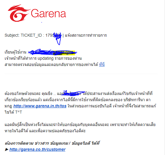 จึงได้ประสานงานไปยัง Garena Support ก็ดำเนินเรื่องส่งเอกสาร กันไปมา จนสุดท้ายแล้วได้ รับการตอบกลับว่า