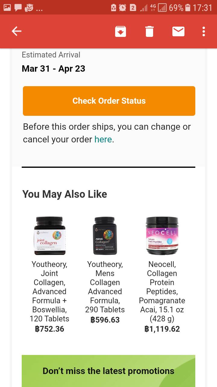 สั่งของตั้งแต่วันที่17มีนาคมแล้วยังไม่ได้ของเลยค่ะทำยังไงดีคะ พอเปิดเมลดูมันก็ขึ้นแบบนี้ค่ะ