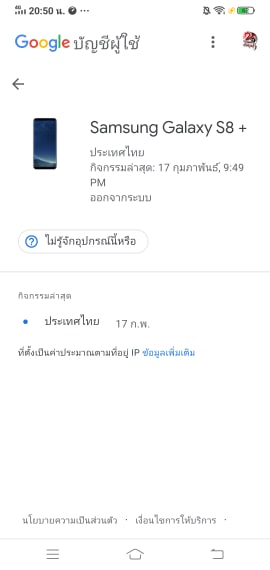 คือผมพึ่งมาเห็นง่ะครับว่า Samsung S8+ ของใครไม่รู้มาเข้ารหัสเราแล้วมันเช็คที่อยู่ไม่ได้เลยครับ ผมกังวลว่าเขาเอารหัสผมไปทำไรไม่ดีหรือป่าว รหัสนี้ผมสร้างมาทำงานร.ด. ส่งครูฝึกเฉยๆกับดูยูทูปครับ พอมีวิธีเช็คว่าเขาเข้ามาทำอะไรยังไงบ้างไหมครับ รหัสนี้ผมไม่เคยให้ใครหรือLoginคอมร้านเกมไรน่ะครับ ใช้ทำงานแค่ที่บ้าน ไม่ก็มันพอมีวิธีหาที่อยู่ของมือถือเครื่องนี้ทางอื่นไหมครับ