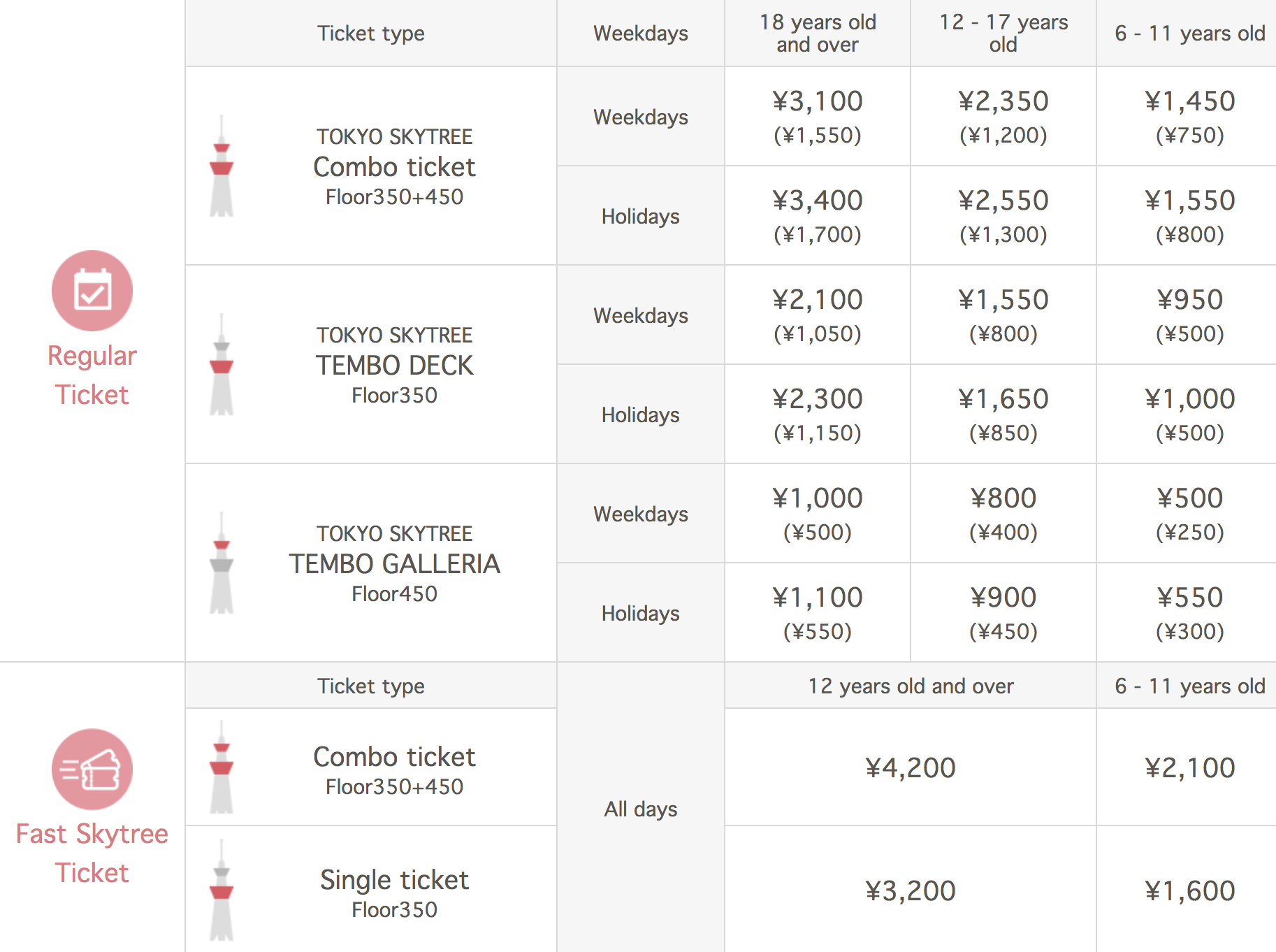 โดยโตเกียวสกายทรีจะแบ่งราคาตั๋วออกเป็นส่วน แบ่งออกเป็นจุดชมวิวที่ความสูง 450 เมตร กับโซน “TOKYO SKYTREE TEMBO GALLERIA” และ จุดชมวิวที่ความสูง 350 เมตร กับโซน“TOKYO SKYTREE TEMBO DECK”