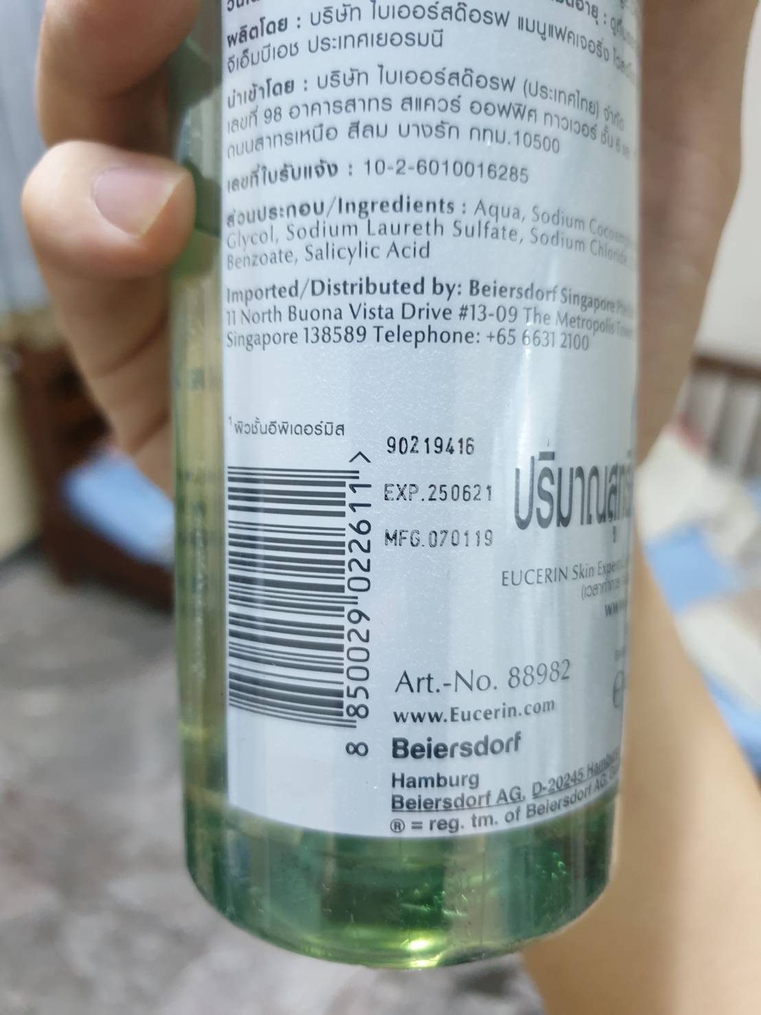 เราได้ซื้อผลิตภัณฑ์ Eucerin Pro Acne cleansing gel 400ml จากจุดจำหน่ายของ Eucerin ของแท้แน่นอน 100% มาเมื่อช่วง ปลาย เดือนตุลาคม 2562 ใช้ได้ประมาณ 8 เดือน โดยวันหมดอายุสินค้าคือ 25/06/21