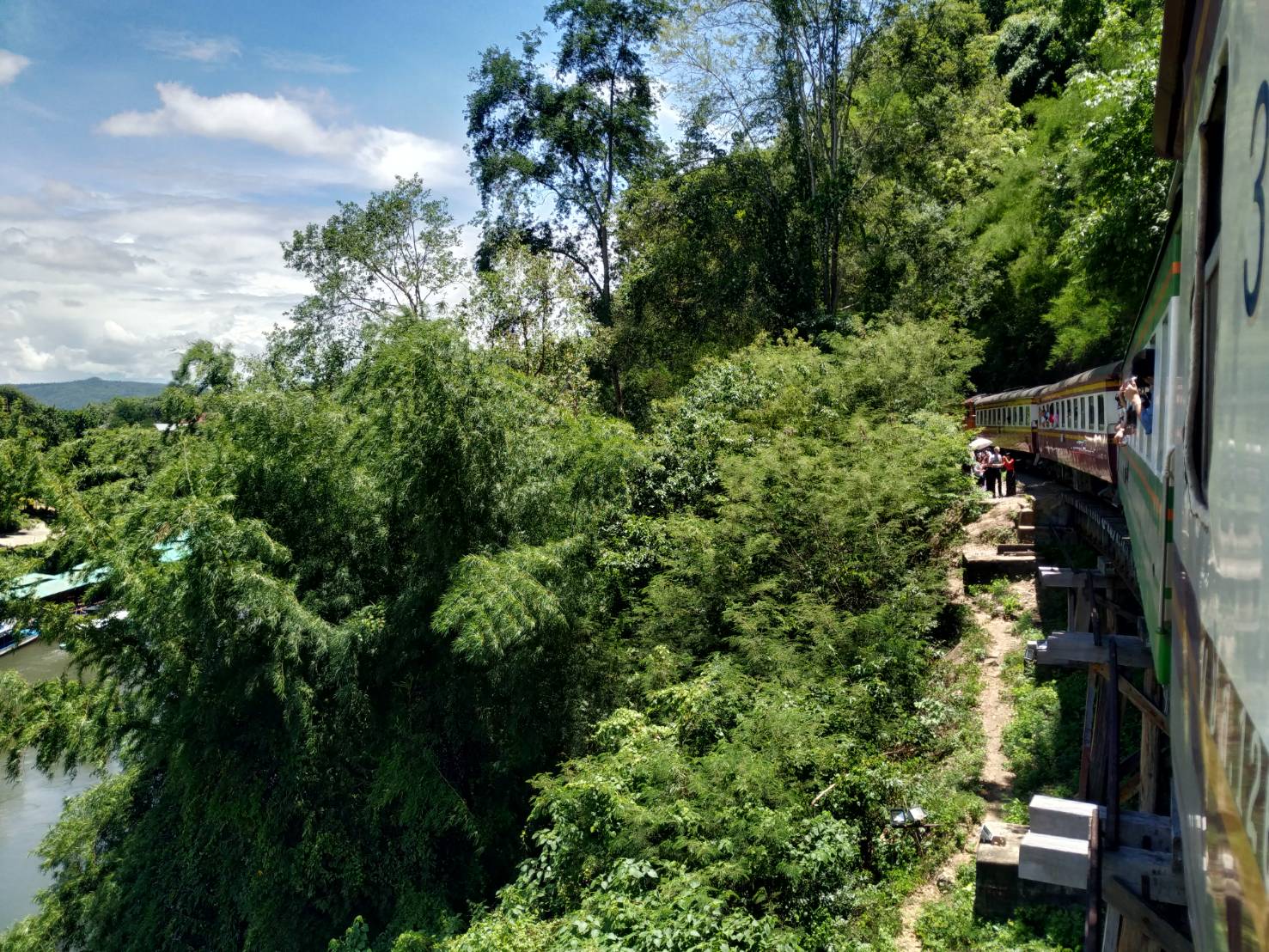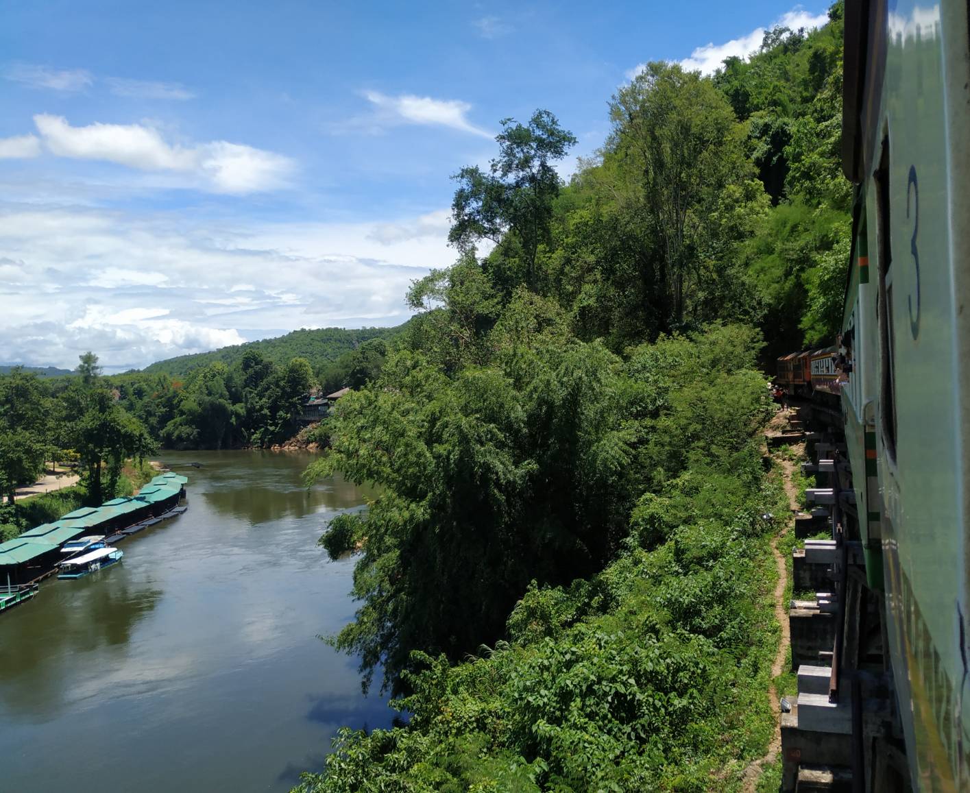 ป่ะ ไปเดินทางกันเลยค่าาาาา ! ในการเดินทางรอบนี้เราก็ไม่ลืมเวฟข้าวกล่องมากินระหว่างทางนะคะและที่สำคัญรอบนี้เราไม่ลืมช้อนจ้าาา ได้กินสมใจแล้วสักที (ฉันจะไม่ยอมใช้มือจกข้าวกินหรอกนะ ! ) ขอบอกเลยว่าเดินทางรถไฟรอบนี้มีดีอย่างนึงคือวิวรอบๆค่ะ วิวสวยมากกกกกกกกกกก มากแบบมากๆ เหมาะสำหรับคนชิลล์ๆ เน้นไปแบบไม่เร่งรีบจิบลมชมธรรมชาติแบบหัวเหนียว (ขนาดสระก่อนเดินทางนะเนี่ยแต่หัวเหนียวได้ไงคิดดู๊ !! บางทีรู้สึกเหมือนหัวขึ้นเกลือด้วยค่ะ 555555) มา ! ไม่รอช้าพอเข้าเขตเมืองกาญเราก็เจอกับจุดแรกคือสะพานรถไฟข้ามแม่นํ้าแคว แต่รู้สึกช่วงนี้นํ้าน้อยนิดหน่อย
