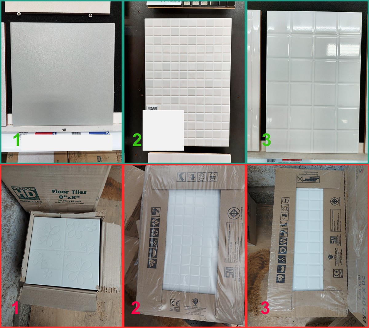 เช้าวันที่ 1 กรกฏาคม 2563 เวลาประมาณ 9.00 น. ของมาส่งตามนัดหมาย แต่ปรากฎว่า ของที่มาส่งที่ผมเลือกไว้ 3 แบบ ส่งมาผิดแบบทั้งหมด ตามรูปภาพ กรอบสีเขียวคือแบบที่ผมสั่ง ผมถ่ายรูปมาจากสาขาตอนที่เลือกไว้ ส่วนกรอบสีแดงคือสินค้าที่มาส่ง