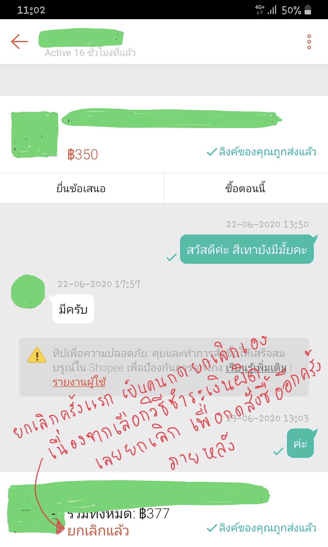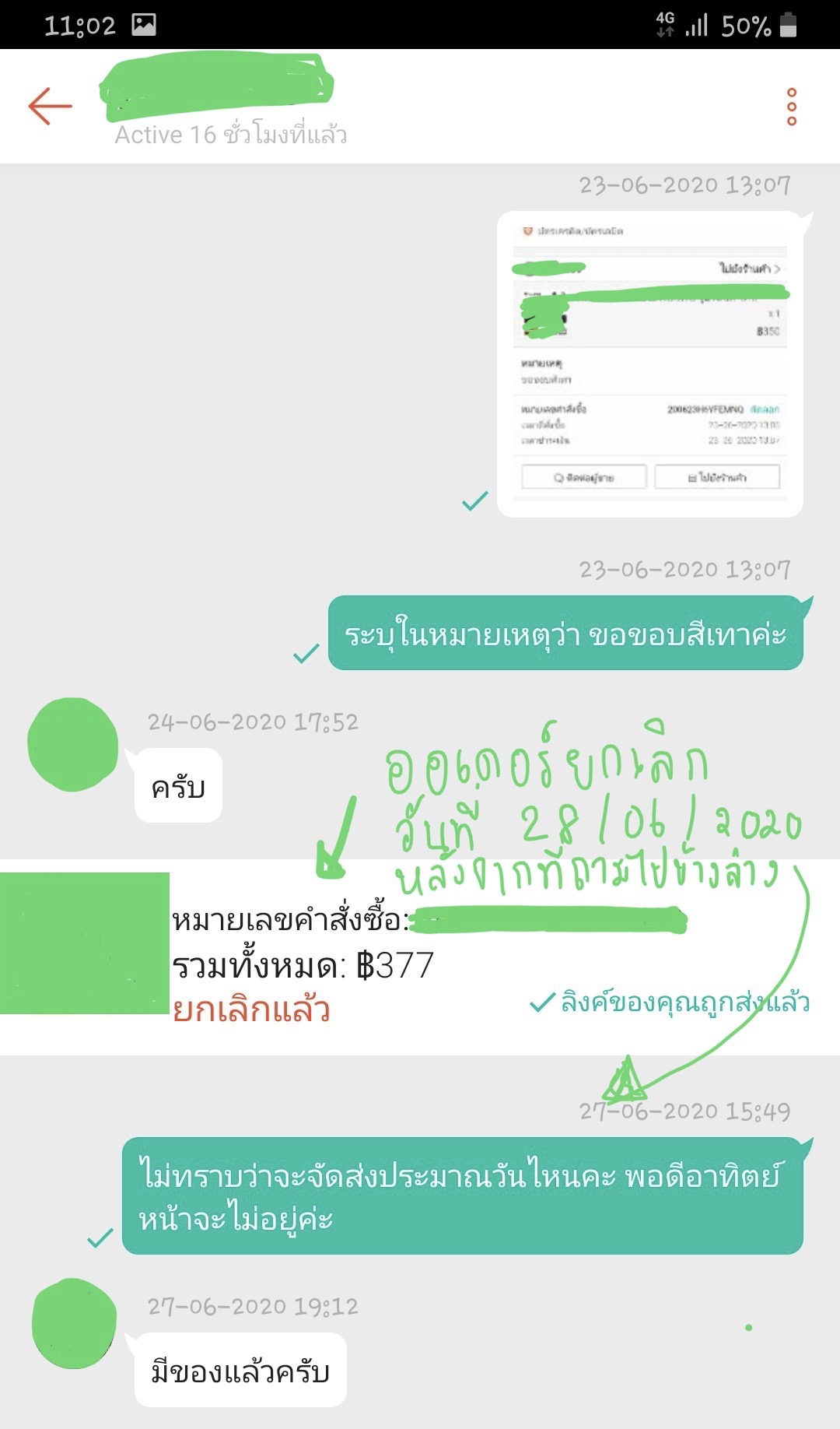 เดี๋ยวจะทำการแนบรูปแชทด้านล่างค่ะ สำหรับการกดยกเลิกครั้งแรก เราเป็นคนกดยกเลิกเอง เพราะเลือกวิธีชำระเงินผิด หลังจากนั้นเราทำการกดสั่งซื้อใหม่อีกรอบ ในวันที่ 23 มิถุนายน 63 มีสถานะขึ้นว่ารอการจัดส่ง หลังจากนั้นคำสั่งซื้อถูกยกเลิกในว้นที่ 28 มิถุนายน 63 (มีแนบรูปรายการสั่งซื้อเพื่อยืนยันวันที่)
