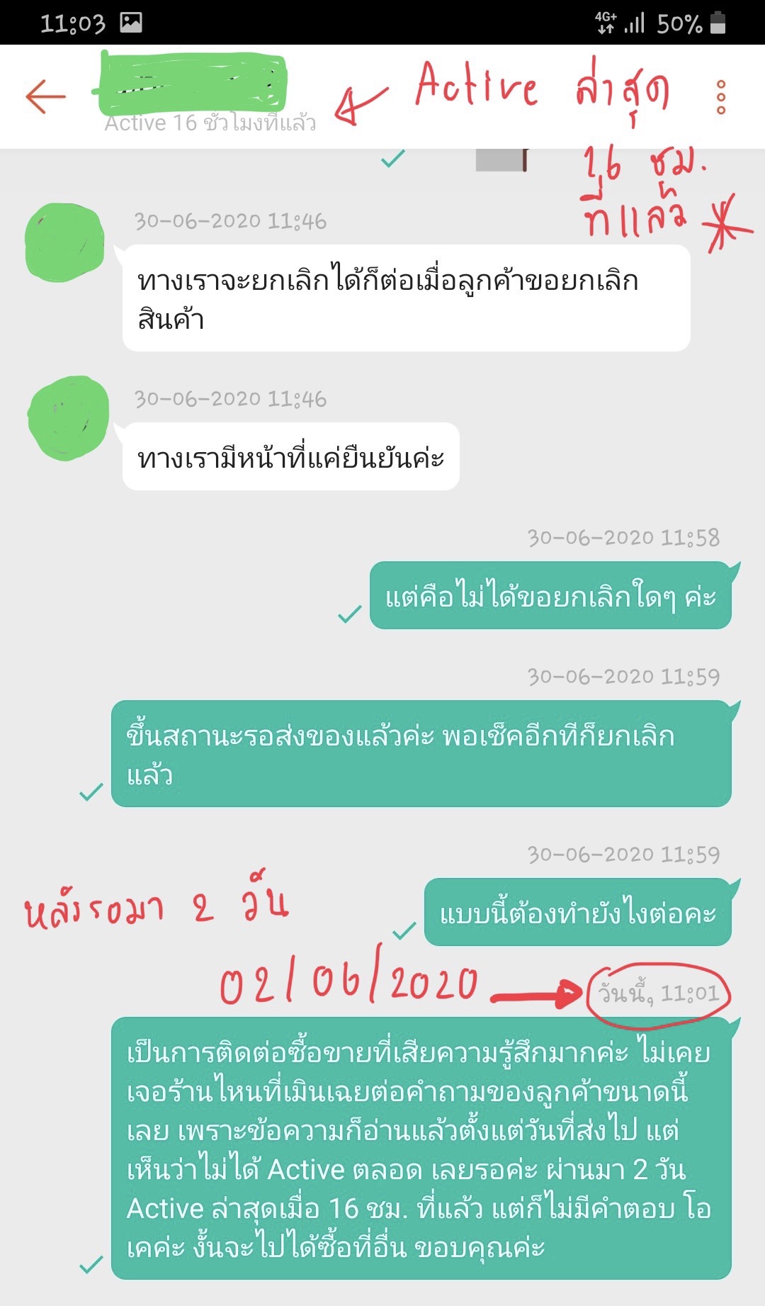 สำหรับกรณีที่อยากแชร์ในกระทู้นี้ เป็นประเด็นของการที่ร้านค้าหนึ่งทำเหมือนเมินเฉยต่อข้อสงสัยของลูกค้า ไม่ตอบแชท และไม่ให้ความกระจ่างในปัญหาที่ได้มีการสอบถามเข้าไปทางกล่องข้อความ ซึ่งเป็นสิ่งที่เรารู้สึกว่าไม่โอเค เพราะระยะเวลาโดยรวมตั้งแต่เริ่มทำการสั่งของ จนกระทั่งครั้งสุดท้ายที่เราส่งข้อความติชมไป รวมเป็นเวลา 9 วัน แต่ไม่มีความกระจ่างว่าเหตุใดอยู่ ๆ สินค้าที่ได้รับสถานะรอจัดส่งแล้วกลับกลายเป็นถูกยกเลิกคำสั่งซื้อ โดยที่ทาง จขกท. ไม่ได้เป็นผู้กดยกเลิกเองแต่อย่างใด เราก็คิดว่าอาจจะเป็นความผิดพลาดที่ระบบ เลยสอบถามไปทางร้าน เผื่อว่าจะหาแนวทางแก้ไข ซึ่งหากเป็นความผิดพลาดที่ระบบ เราก็พร้อมที่จะเข้าใจ และพร้อมที่จะลองแก้ปัญหาไปพร้อมกัน เพราะเราเองไม่ได้จะรีบใช้มาก แต่ต้องคิดถึงกรณีที่ถ้าหากลูกค้าต้องรีบใช้ของ มันจะเสียความรู้สึกกันมากกว่านี้แน่นอน สำหรับคำถามล่าสุดที่เราสอบถามไป จนเวลาผ่านมา 2 วัน ยังไม่มีการตอบแชทลูกค้า ทั้ง ๆ ที่เวลาที่ออนไลน์ล่าสุดของร้านค้าคือเมื่อ 16 ชั่วโมงก่อนหน้า และสิ่งที่ทำให้เรามั่นใจว่าได้มีการอ่านข้อความแล้ว เนื่องจากสามารถเช็คได้ว่ายังมีข้อความที่ไม่ได้อ่านหรือไม่ ซึ่งจริง ๆ ได้รับการอ่านหมดแล้วตั้งแต่วันที่ส่งข้อความ เราก็เลยติดชมไปเป็นข้อความล่าสุดค่ะ
