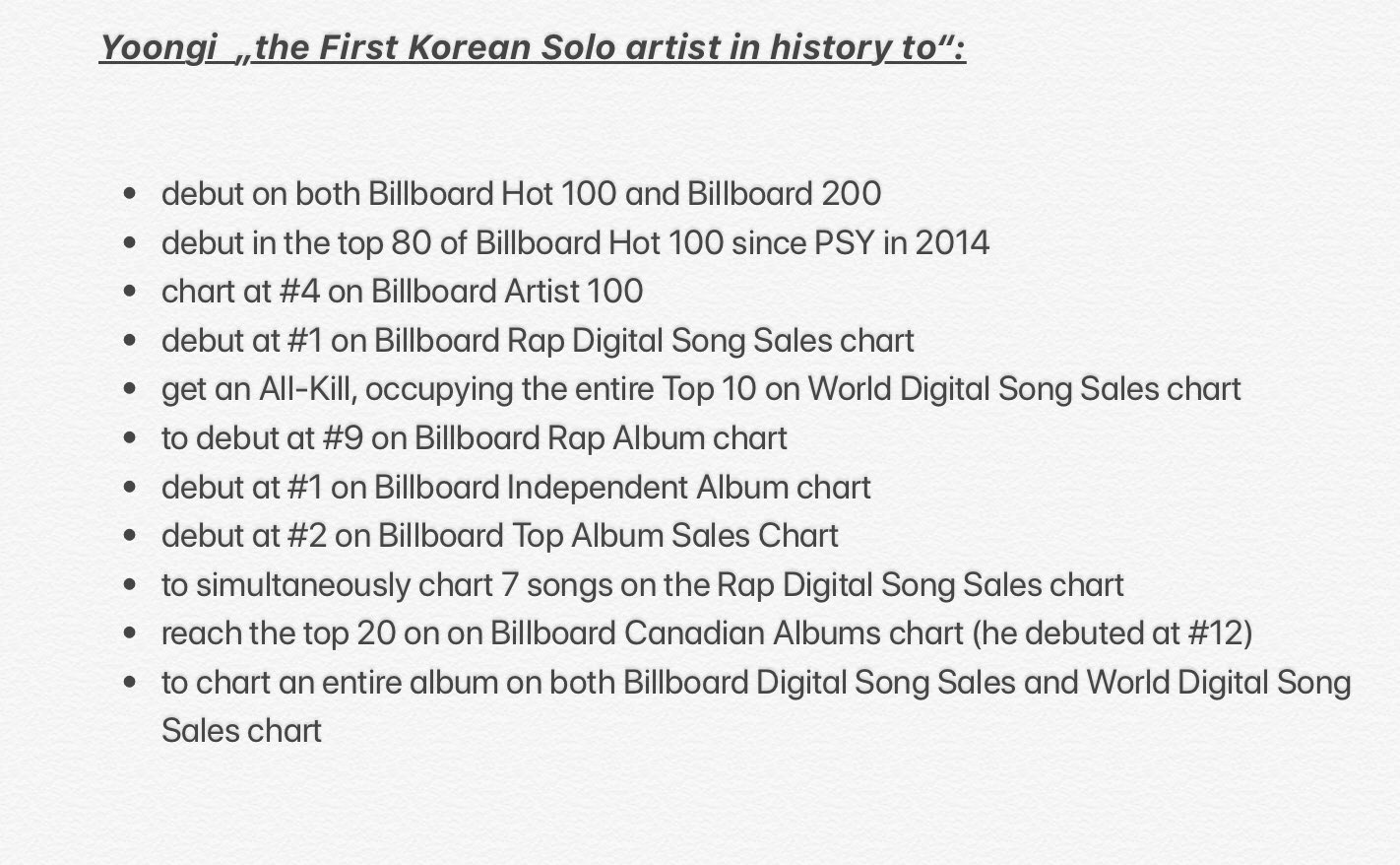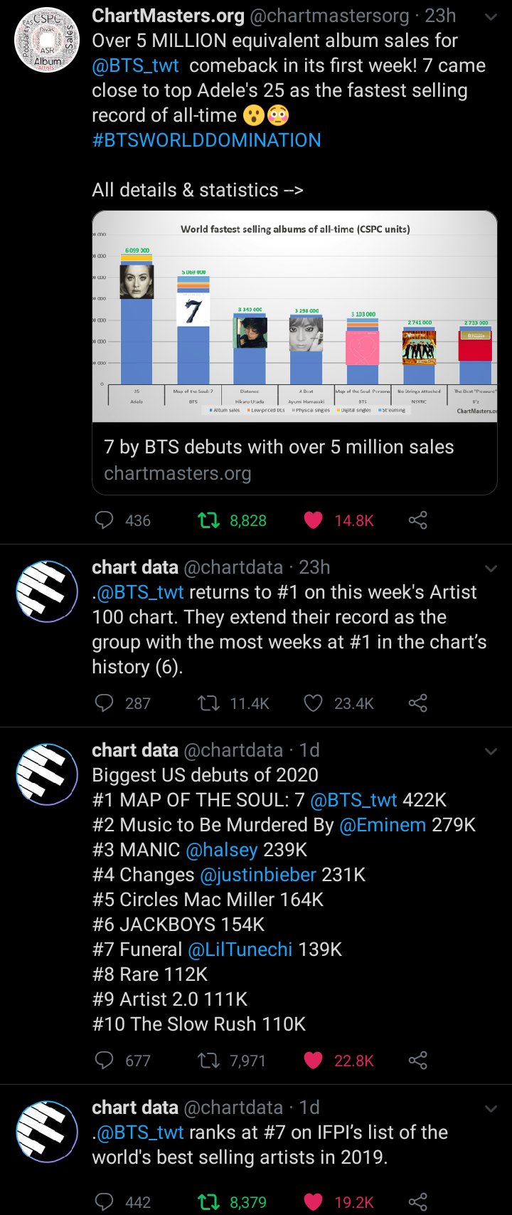 - อัลบั้ม Map of the Soul: ติดอันดับ 1 ชาร์ต Billboard 200 ( 4 อัลบั้มต่อเนื่อง)