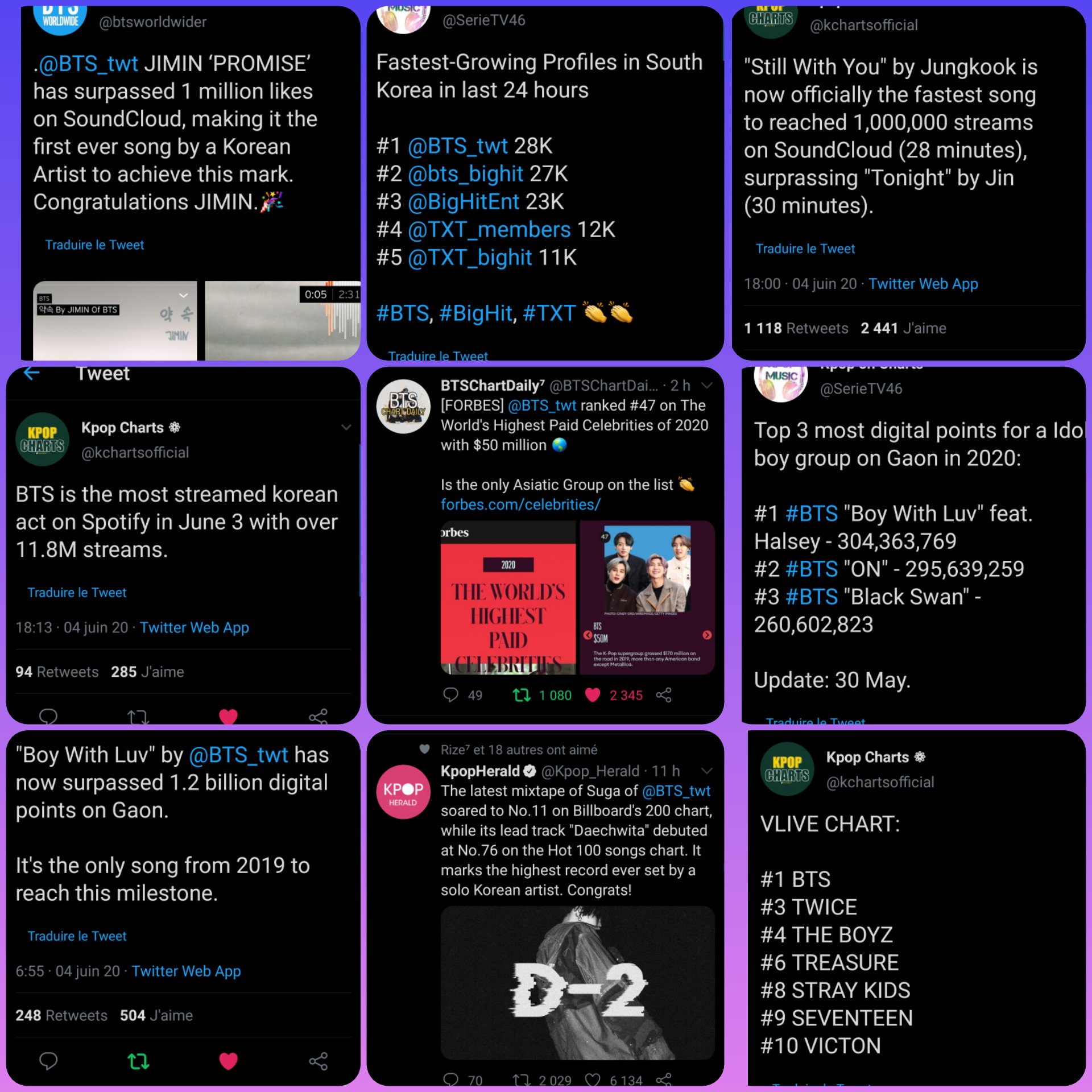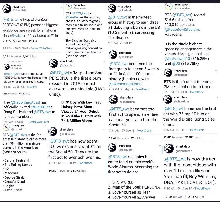 - บังทันเป็นศิลปินที่ทำสถิติครองอันดับ 1 ต่อเนื่องยาวนานที่สุด 164 สัปดาห์บนชาร์ต Billboard Social 50 (สูงสุดตลอดการ) ทำลายสถิติเดิมจัสติน