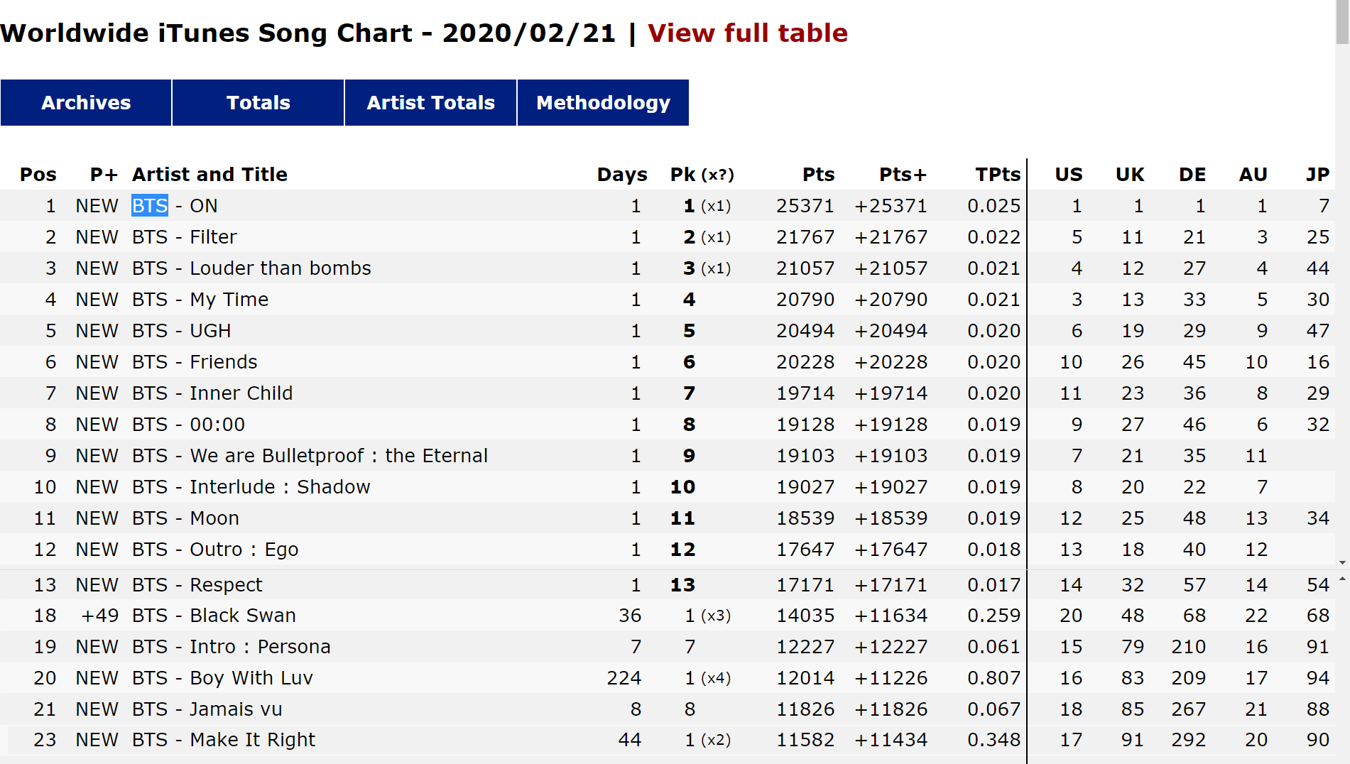 - เพลง Black Swan (เพลง b-side) เปิดตัวอันดับ 1 บนชาร์ต iTunes US และ UK และขึ้นอันดับ 1 iTunes ทั้งหมดใน 24 ชม. 94 ประเทศ (สูงสุดตลอดกาลของศิลปินเกาหลี)