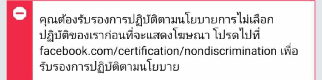 พอจะกดโปรโมท จะมีตัวหนังสือแถบสีแดงเด้งขึ้นมาว่า คุณต้องรับรองการปฏิบัติตามนโยบายการไม่เลือกปฏิบัติ บลาๆ