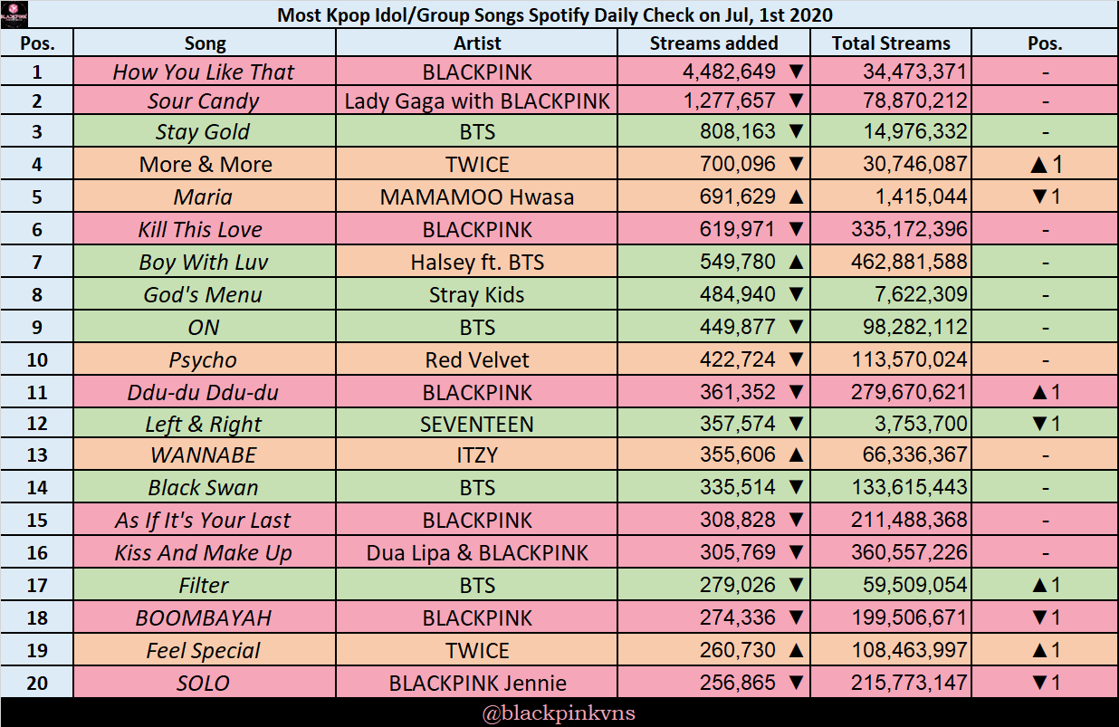 เพลง How You Like That ของ BLACKPINK เป็นเพลงศิลปินกลุ่มเคป๊อปที่มียอดสตรีม (Spotify+YouTube music) สูงสุดในประวัติศาสตร์ อุตสาหกรรมเคป๊อป โดยใน Top 10 มีเพลงของ BP คิดถึง 6 เพลง ส่วน BTS ติด 4 เพลง