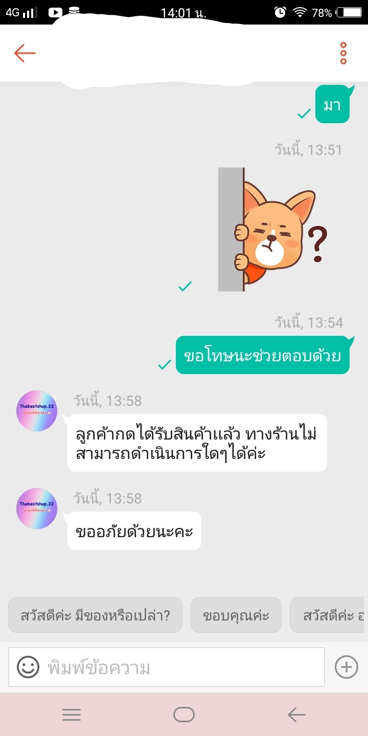ขออภัยในความไม่สะดวกที่เกิดขึ้นนะคะ หากคุณสมาชิกหมายเลข 4479066 กดยอมรับสินค้าไปแล้ว จะทำให้หลุดจาก Shopee การันตีค่ะ หากต้องการเปลี่ยนสินค้า หรือคืนเงินนั้น แอดมินแนะนำให้สอบถามกับทางร้านค้าได้โดยตรงเลยนะคะ