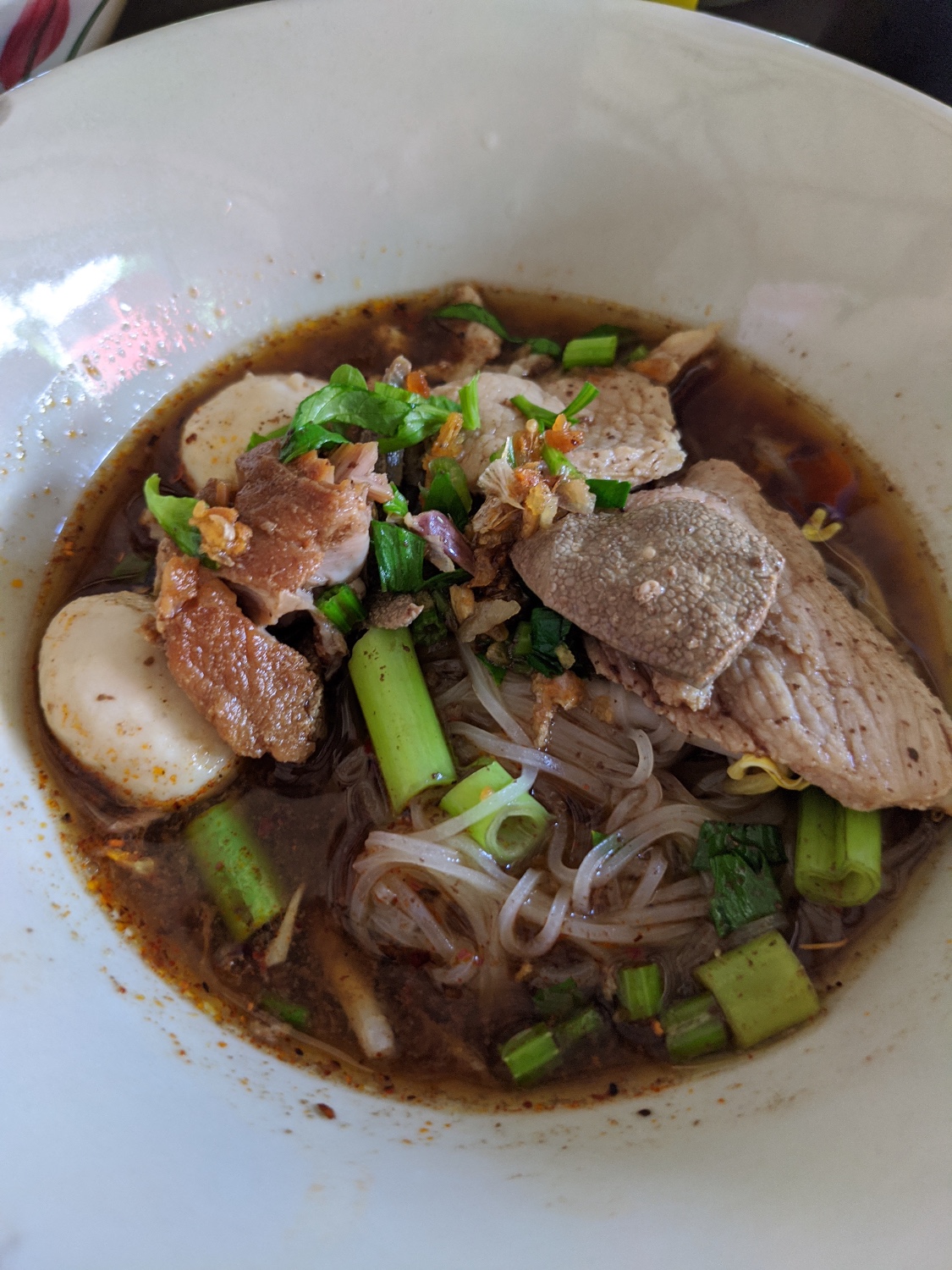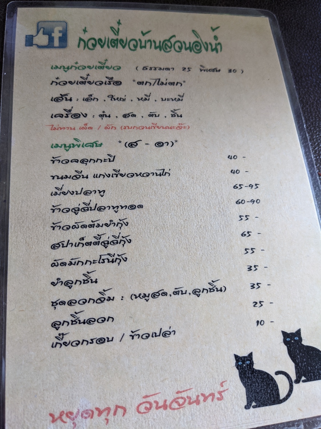 ร้านก๋วยเตี๋ยวดัง ริมน้ำ ที่คนเยอะมาก ต้องต่อคิวรอกันนานและที่จอดรถต้องใช้ฝีมืออย่างมากในการจอด เพราะถนนทางเข้าแคบมากๆ รสชาติอาหารอร่อยๆ มีข้าวอย่างอื่นให้สั่ง เช่นข้าวผัดต้มยำกุ้ง แต่ที่สั่งมา เป็นก๋วยเตี๋ยวเรือน้ำตกใส่ทุกอย่าง กับข้าวคลุกกะปิ