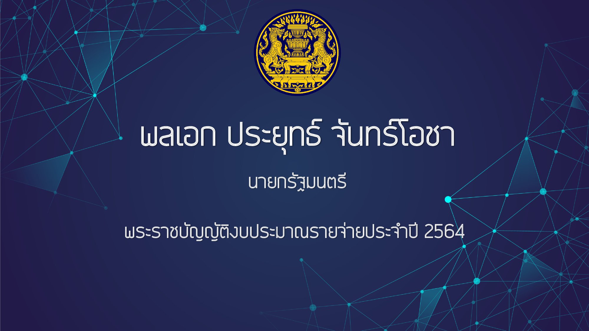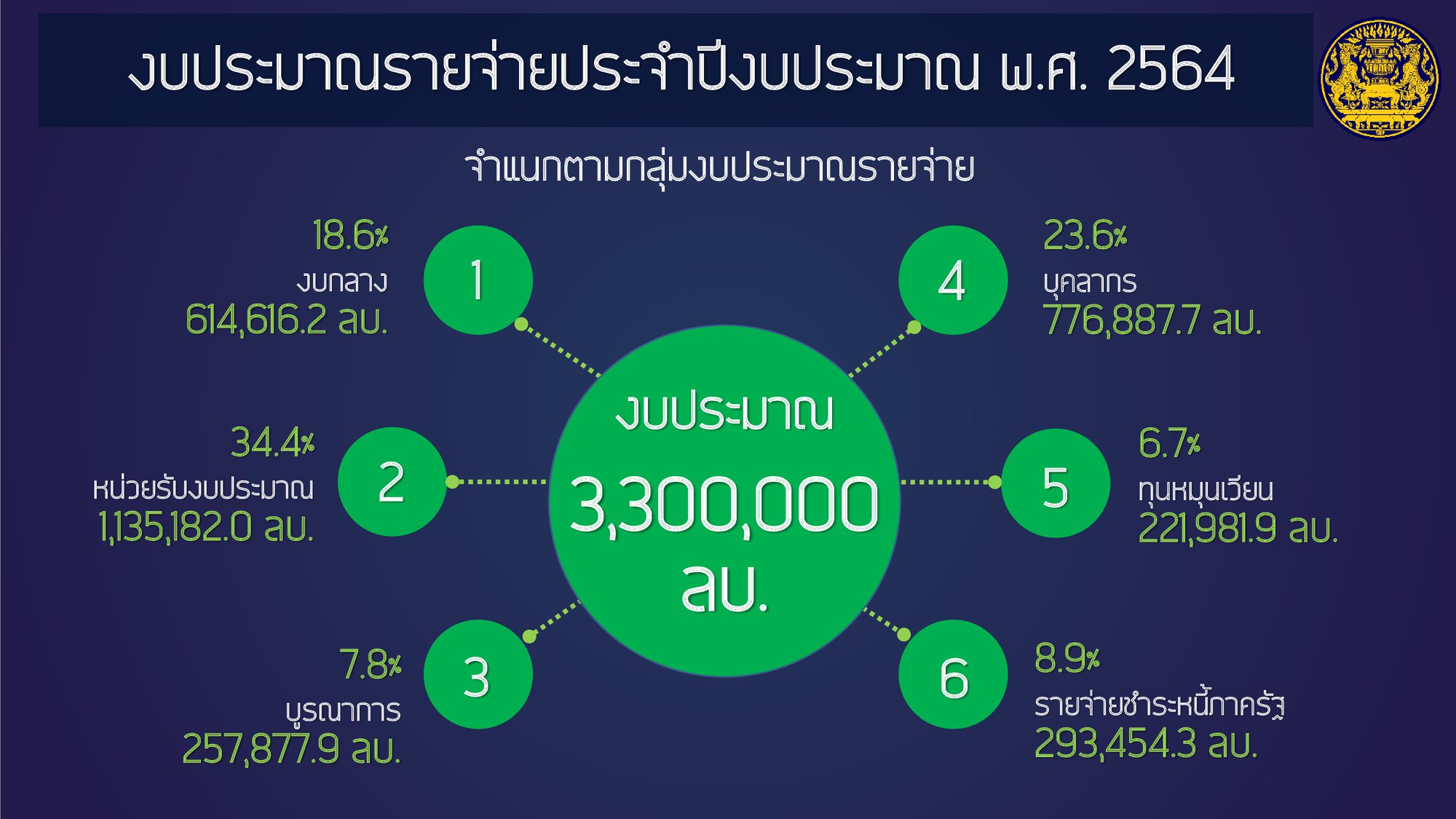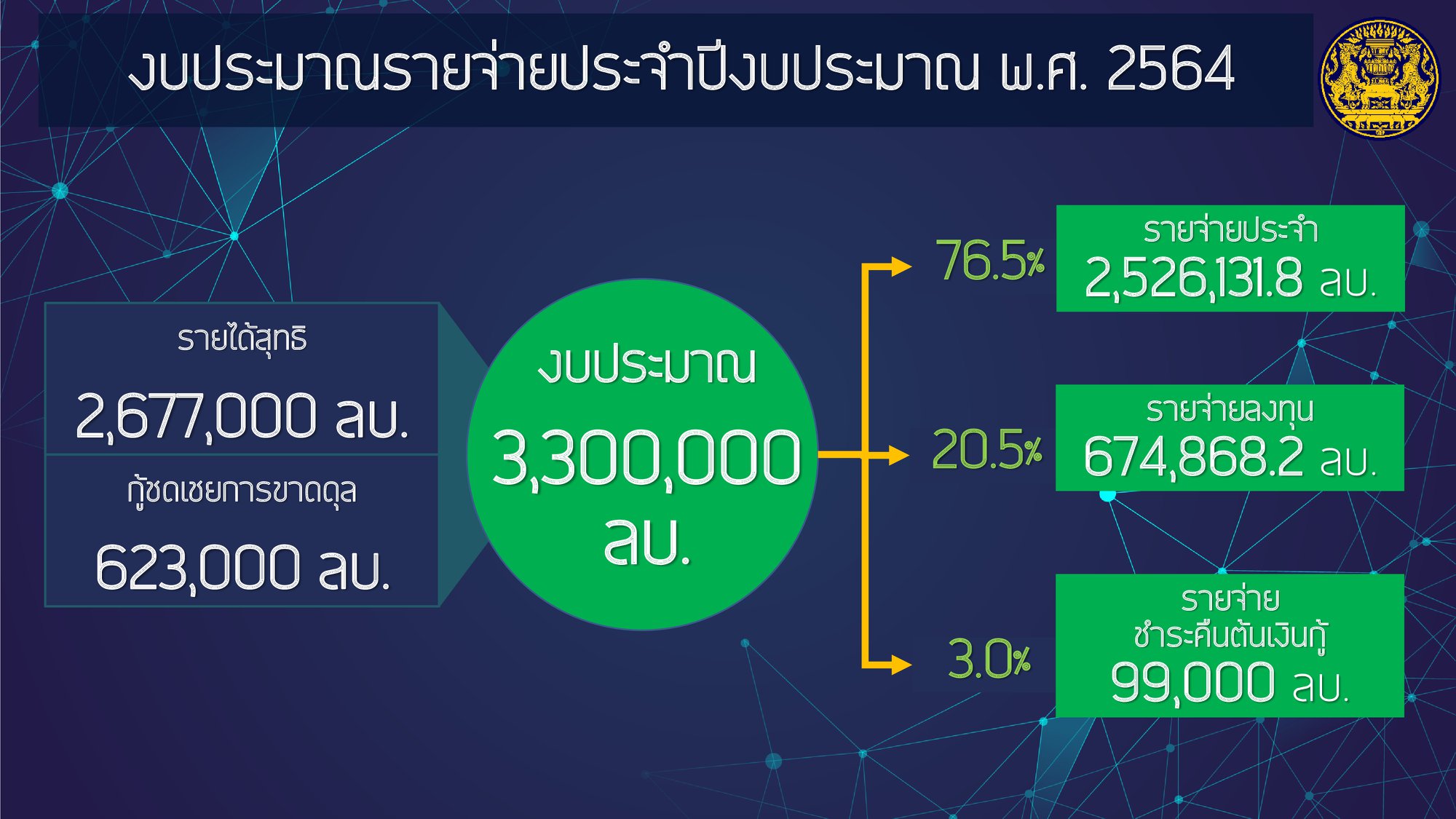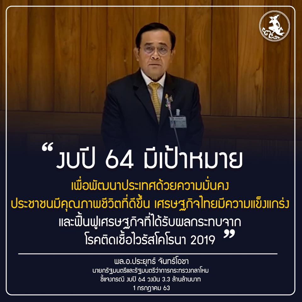 #ไทยคู่ฟ้า เอกสารประกอบการแถลงงบประมาณรายจ่ายประจำปี 2564 ของนายกรัฐมนตรีต่อสภาผู้แทนราษฎร โดยงบประมาณนี้จะเป็นเครื่องมือสำคัญในการผลักดันนโยบายและมาตรการต่าง ๆ ให้ขับเคลื่อนไปได้อย่างมีประสิทธิภาพ และเป็นประโยชน์ต่อประชาชน สอดคล้องกับยุทธศาสตร์ทั้ง 6 ด้านของรัฐบาล คือ