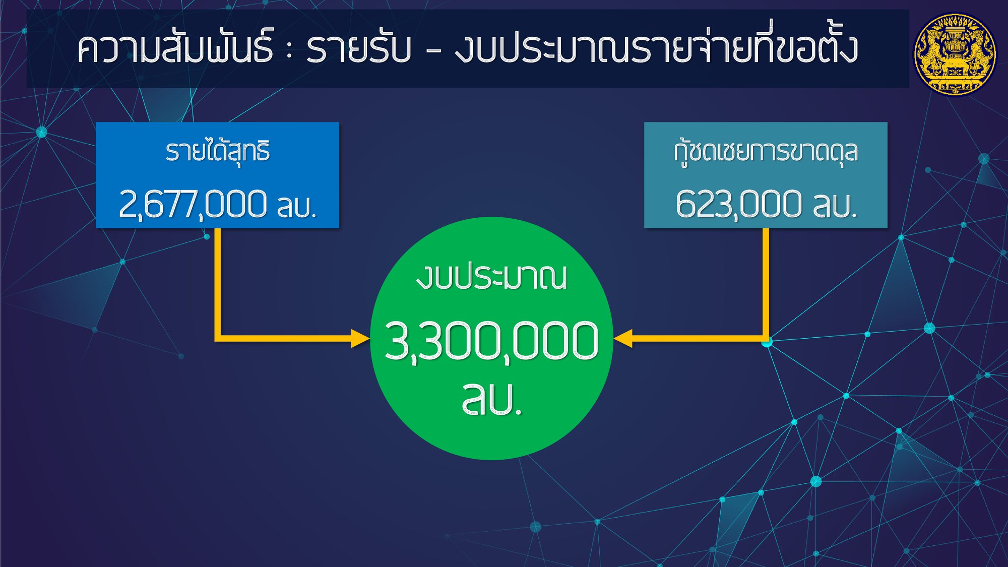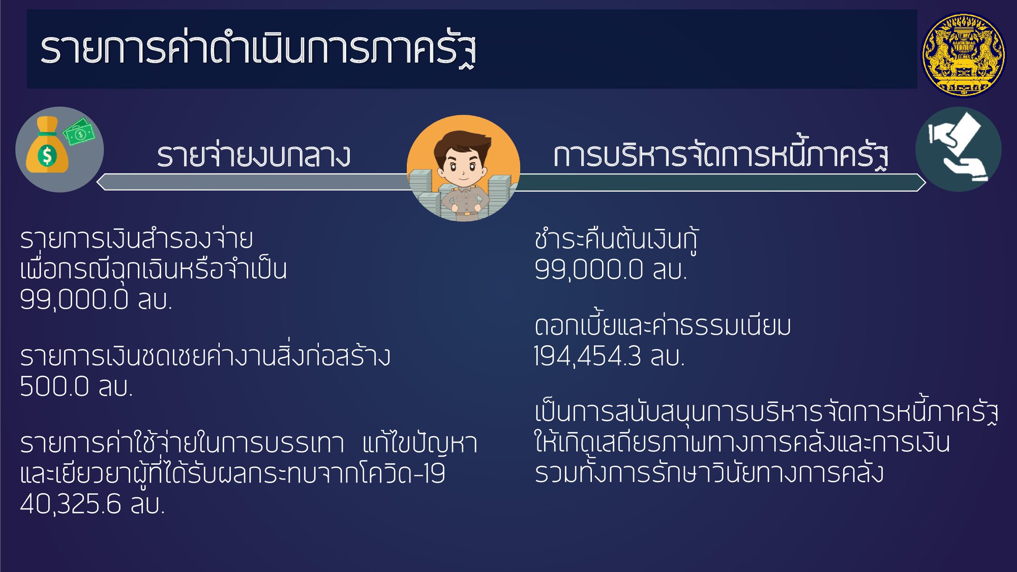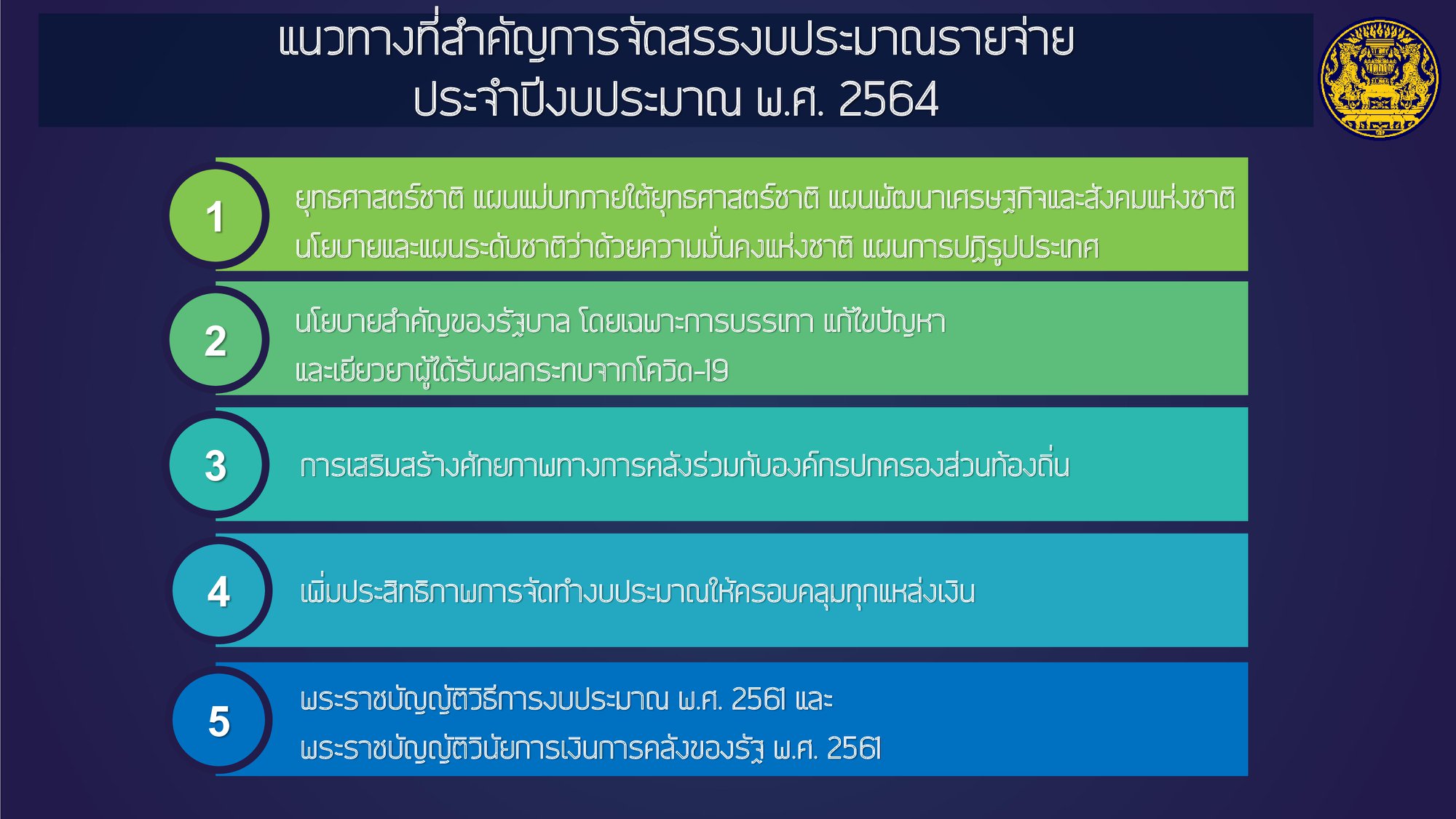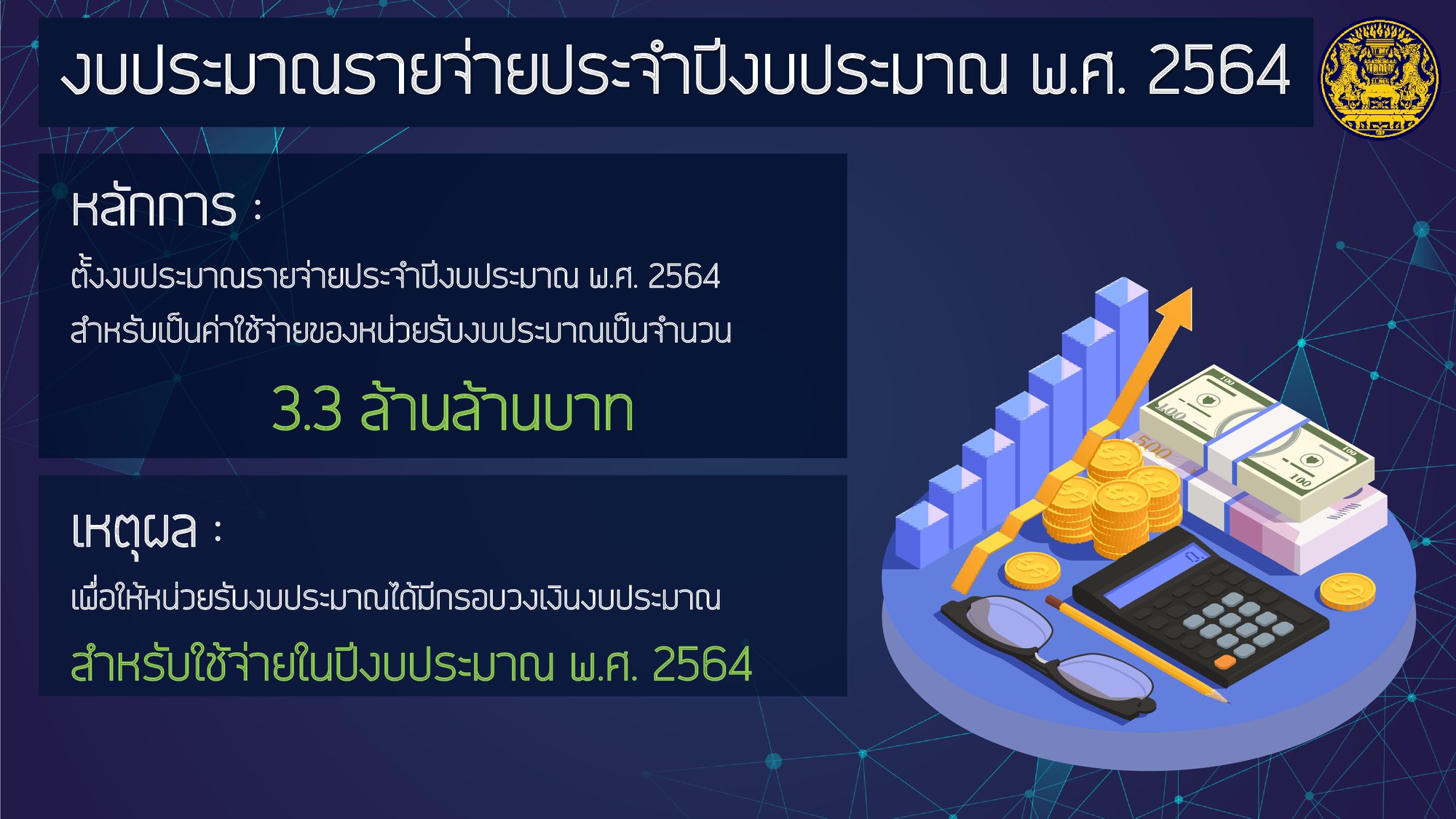 #ไทยคู่ฟ้า เอกสารประกอบการแถลงงบประมาณรายจ่ายประจำปี 2564 ของนายกรัฐมนตรีต่อสภาผู้แทนราษฎร โดยงบประมาณนี้จะเป็นเครื่องมือสำคัญในการผลักดันนโยบายและมาตรการต่าง ๆ ให้ขับเคลื่อนไปได้อย่างมีประสิทธิภาพ และเป็นประโยชน์ต่อประชาชน สอดคล้องกับยุทธศาสตร์ทั้ง 6 ด้านของรัฐบาล คือ